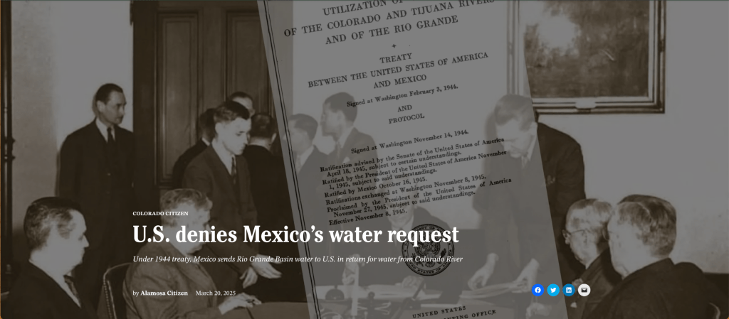 When comparing challenges of Colorado River users to the Rio Grande, researchers say the โwater crisis facing the RGB is arguably more severe and urgent than the CRB,โ given the fact groundwater in the San Luis Valley has been depleted at a rate of 89,000 acre-feet per year; New Mexico has a water debt to Texas; and Mexico has a mounting water debt to the U.S. under a 1944 treaty that is causing political tension between the two countries.