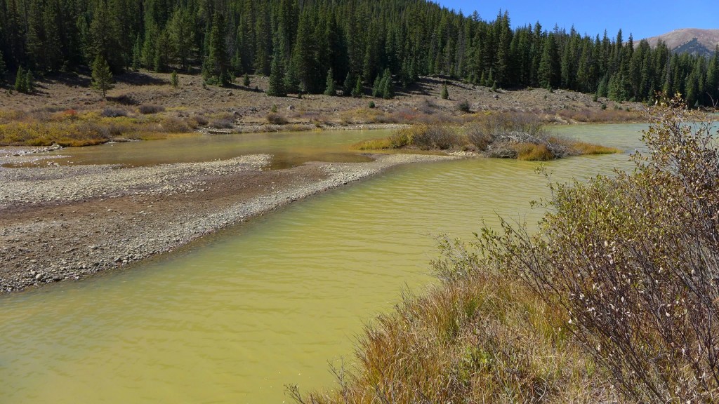 Lincoln Creek is one of several drainages that flow into Grizzly Reservoir, a collection pool for Twin Lakes Reservoir and Canal Company. Drainage from defunct upstream mines may be partly responsible for the water’s yellow color. Photo credit: Heather Sackett/Aspen Journalism