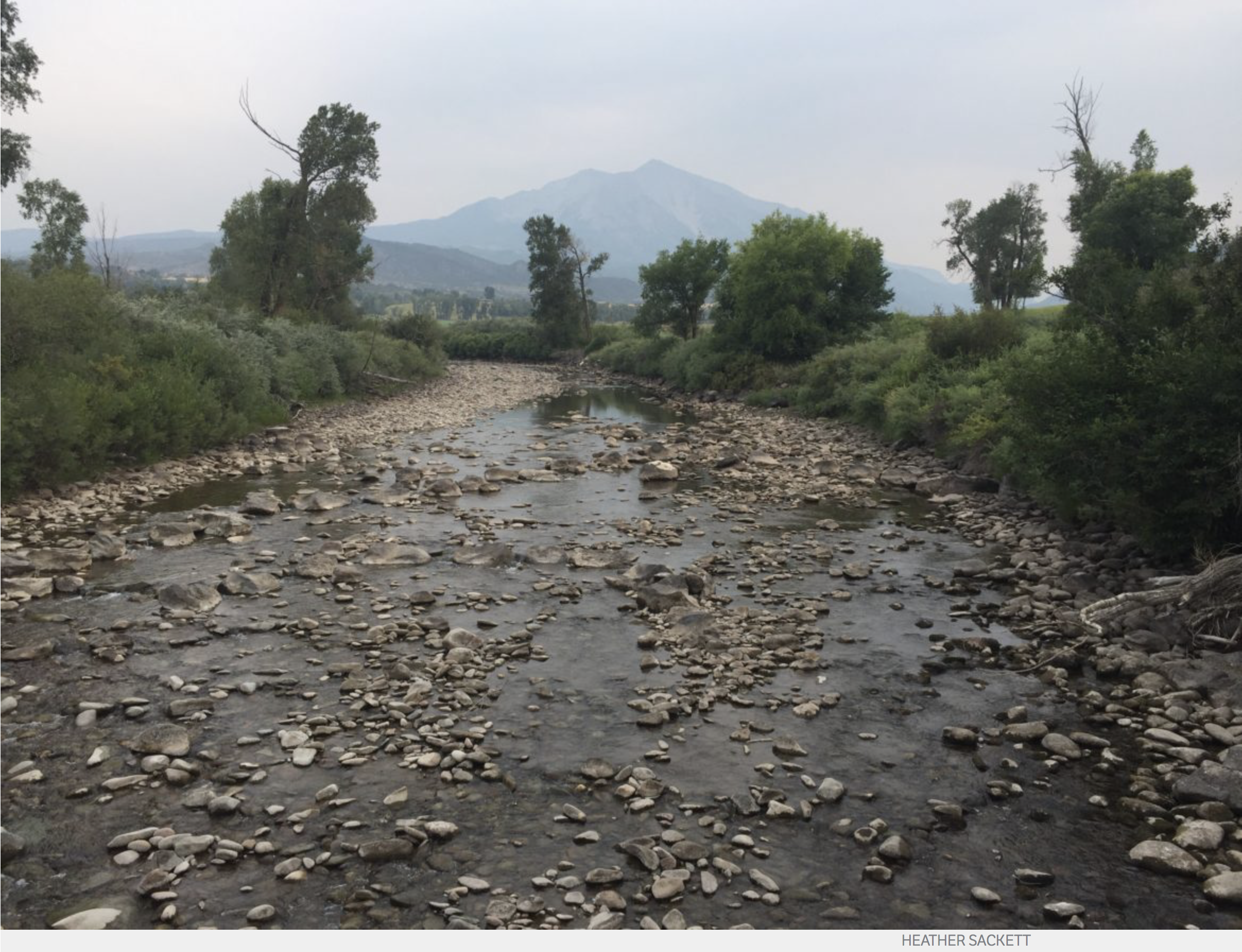 The Crystal River was running under 8 cfs on Aug. 24, 2025. This section of river is downstream of big agricultural diversions and ditches owned and maintained by the Town of Carbondale. CREDIT: HEATHER SACKETT/ASPEN JOURNALISM