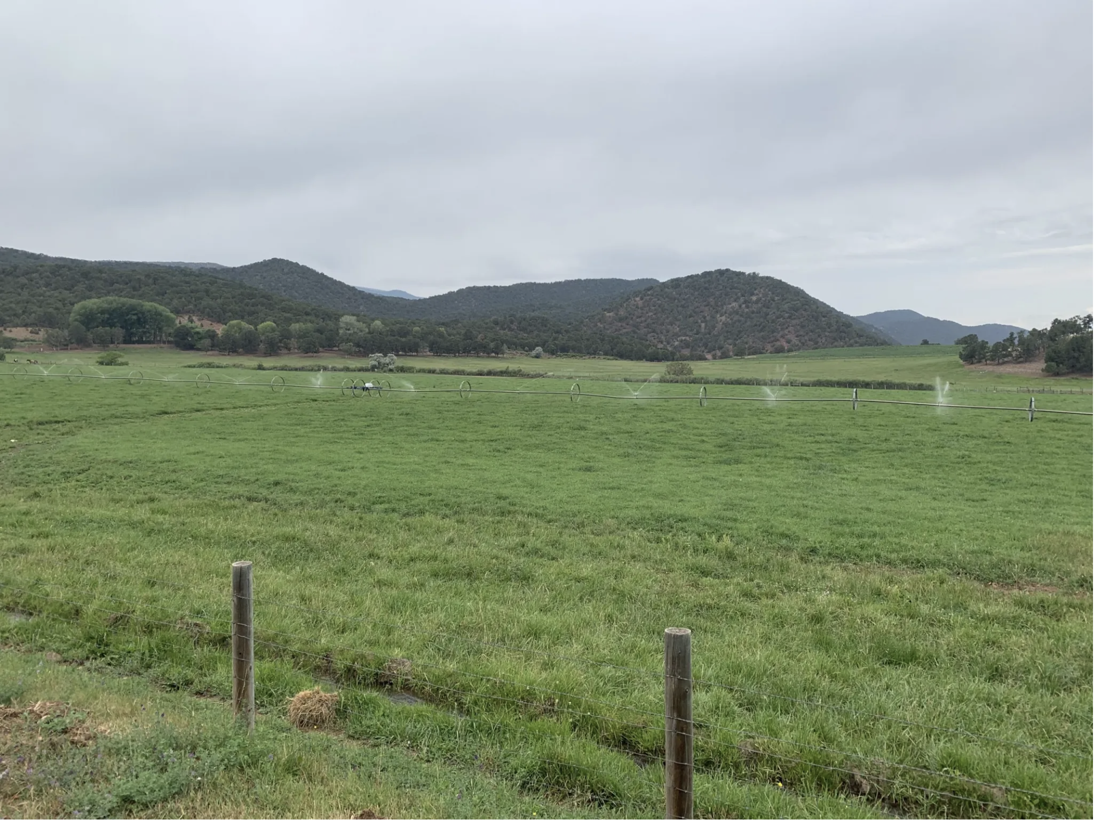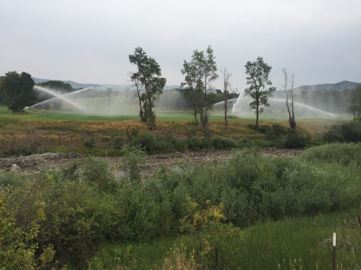 Sprinklers irrigate land on the east side of the Crystal River (in foreground) in August 2018, one of its driest years in recent history. A call by a downstream senior water rights holder during the drought of 2018 illustrated a long-simmering problem: several subdivisions in the Crystal River Valley don’t have back-up water plans. Photo credit: Heather Sackett/Aspen Journalism