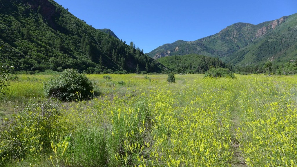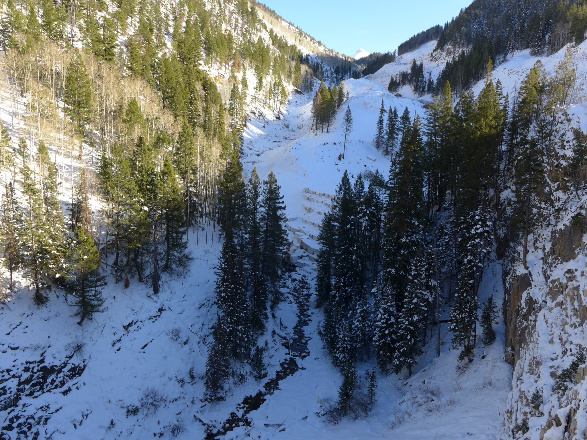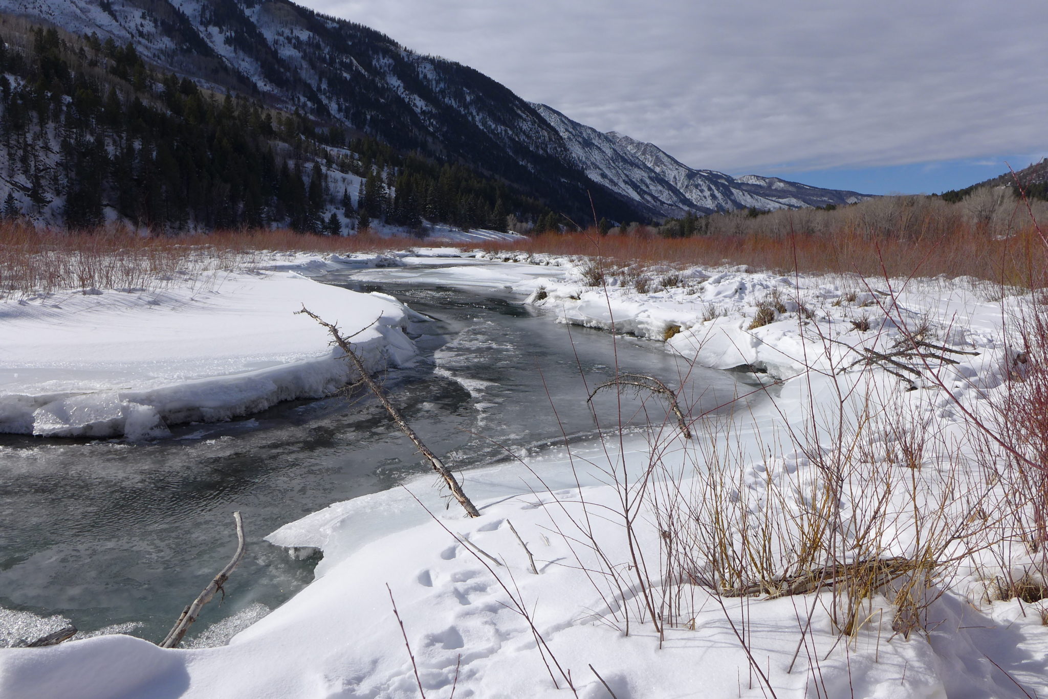 The banks of the Crystal just upstream from Redstone are lined with narrowleaf cottonwood and blue spruce. Cottonwoods in particular need the rushing flows of spring runoff for their seeds to germinate and have evolved to disperse their seeds just after the high point of snowmelt each year. The seeds, carried along the wind by a bit of fluff, land in the bare, wet, mineral soil of streambanks where some of them take root.