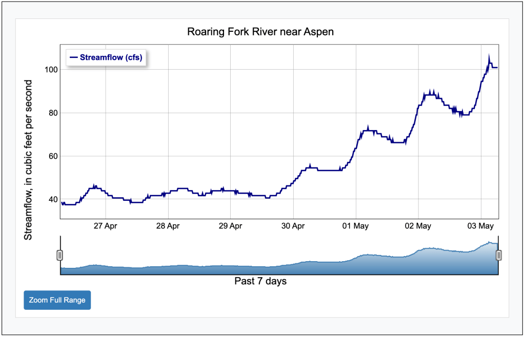 Before this week’s rainfall, the Roaring Fork above Aspen hovered around 30 cfs.
