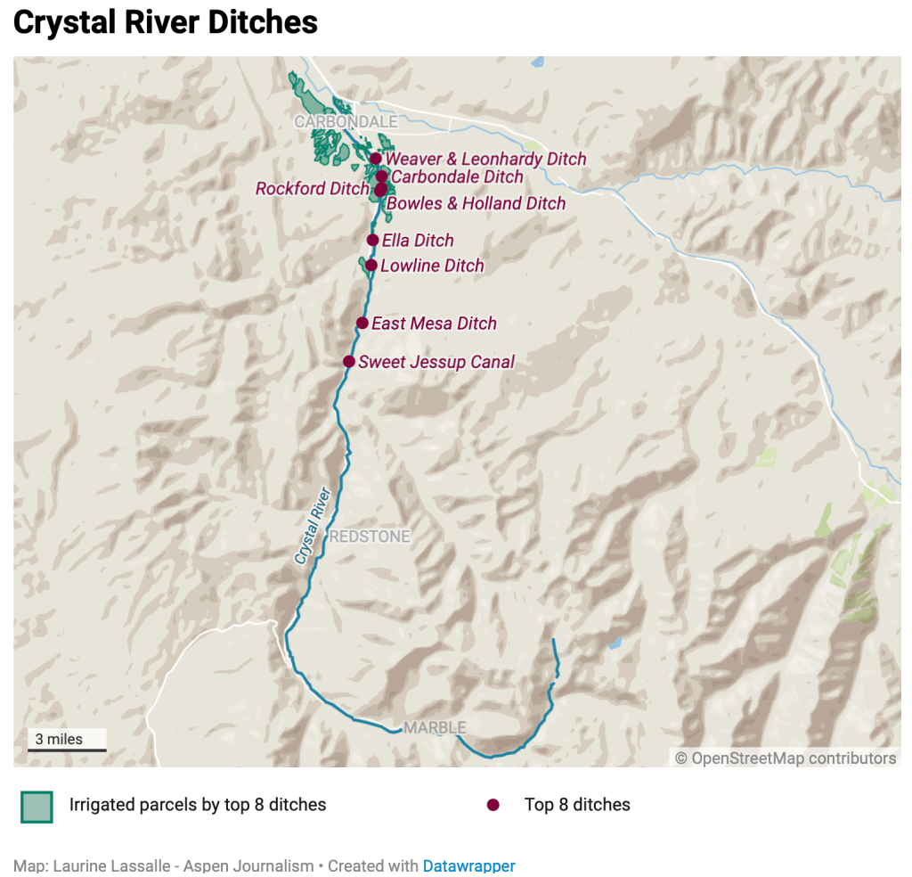 he historic drought late in the summer of 2018 illustrated some long-acknowledged problems with water rights on the Crystal. In August and again in September, the Ella Ditch, which irrigates agricultural land south of Carbondale, placed a call on the river for the first time ever. This means, in theory, that junior-rights holders upstream have to stop taking water so that the Ella Ditch can receive its full decreed amount.