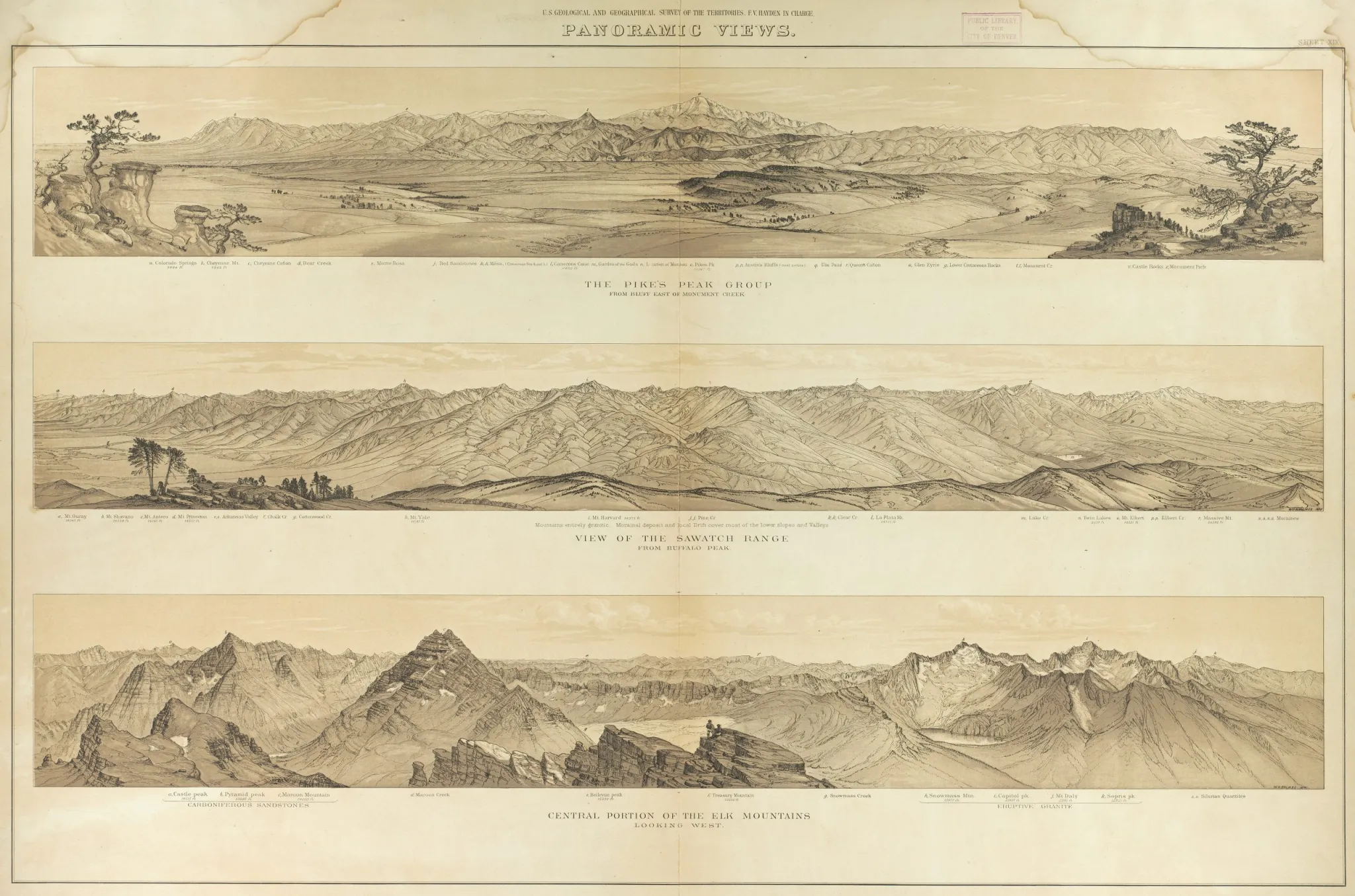 The Hayden Survey produced detailed drawings of multiple mountainscapes across Colorado, including these depictions of Pikes Peak, the Sawatch Range and Elk Range. CREDIT: DENVER PUBLIC LIBRARY