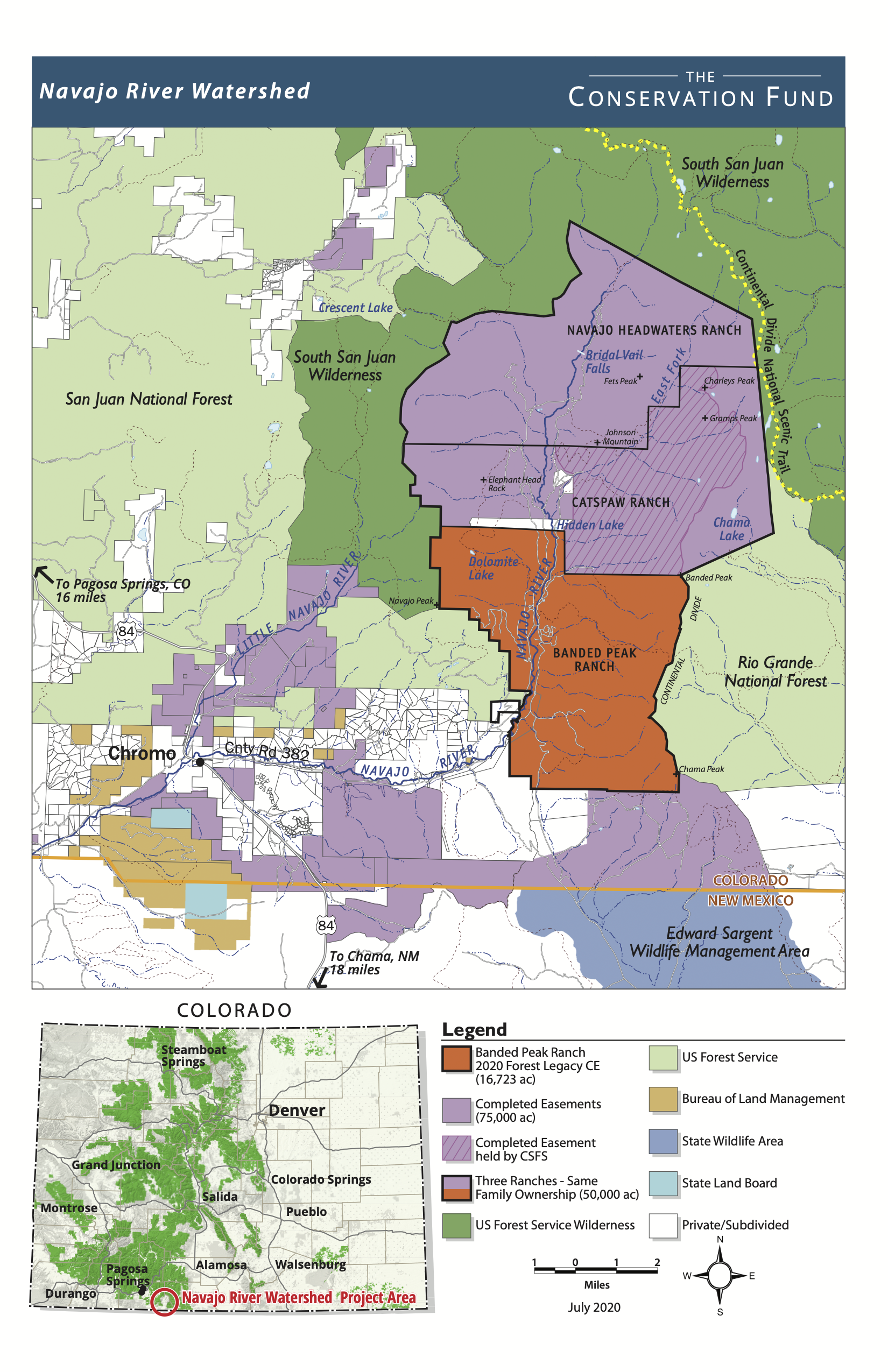 The completion of a conservation easement on Banded Peak Ranch is the final phase of a 30-year effort by The Conservation Fund in the Navajo River Watershed – protecting a total of 65,000 acres that connect wilderness ranches in the upper reaches of the watershed to conserved working ranches at lower elevations on the Navajo, Little Navajo and East Fork of the San Juan rivers. Permanent protection of these lands is the product of public-private partnerships involving 10 different ranches. Over the years, the Navajo River watershed project area has attracted $37 million from federal, state and private partners, including private foundations, Great Outdoors Colorado (GOCO), the federal Forest Legacy Program, which is managed in Colorado by the Colorado State Forest Service, and private landowner donations.