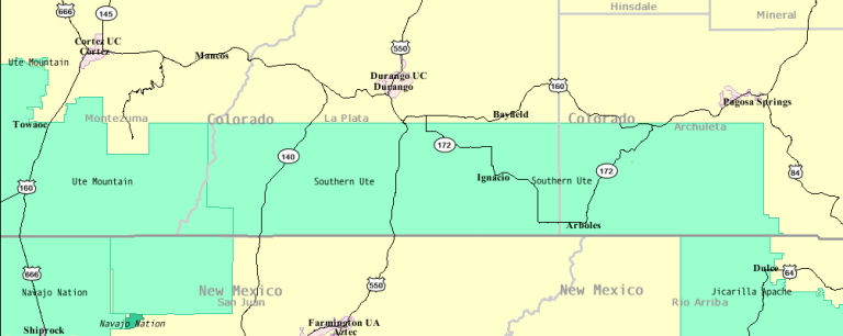 A map of the Southern Ute Reservation and nearby reservations. By U.S. Census Bureau – U.S. Census Bureau: American FactFinder, a combination of two maps, Public Domain, https://commons.wikimedia.org/w/index.php?curid=3114932