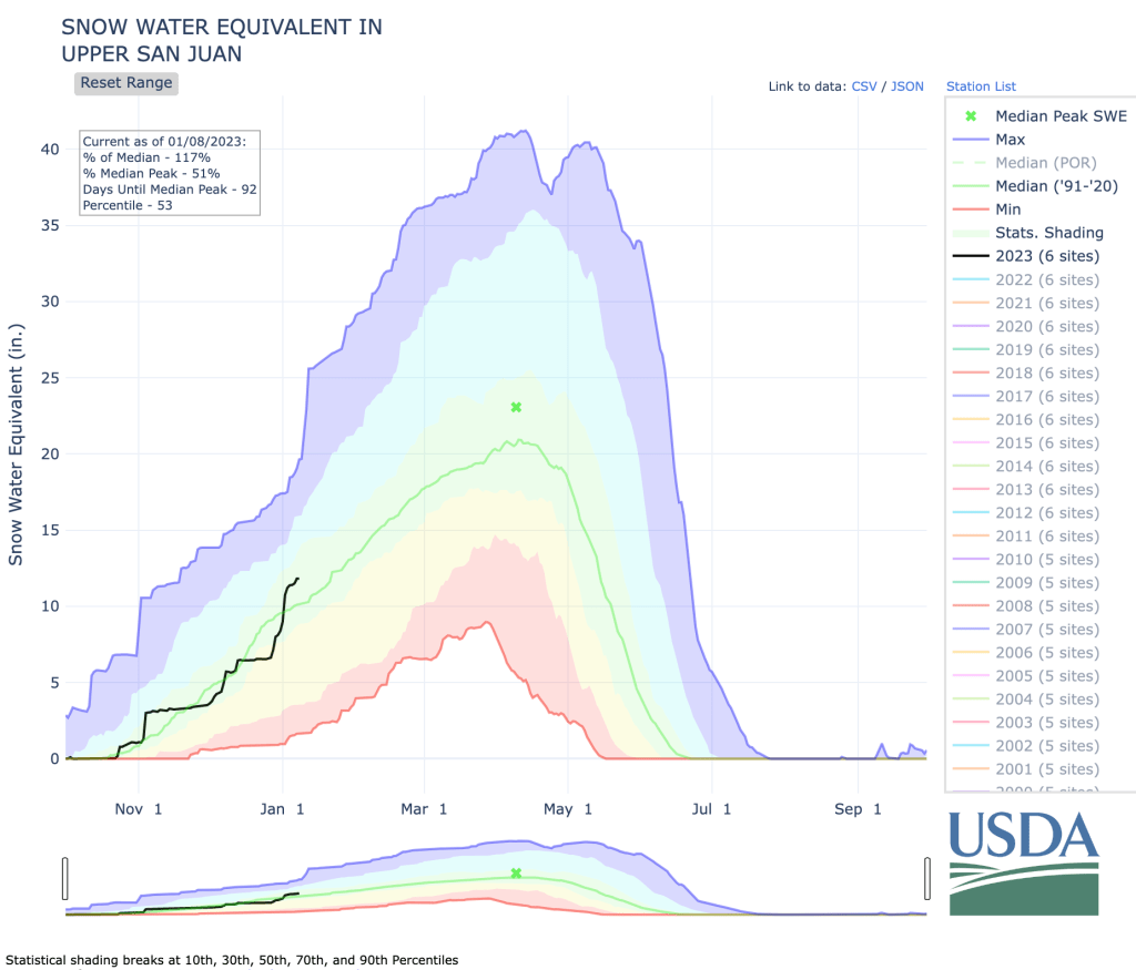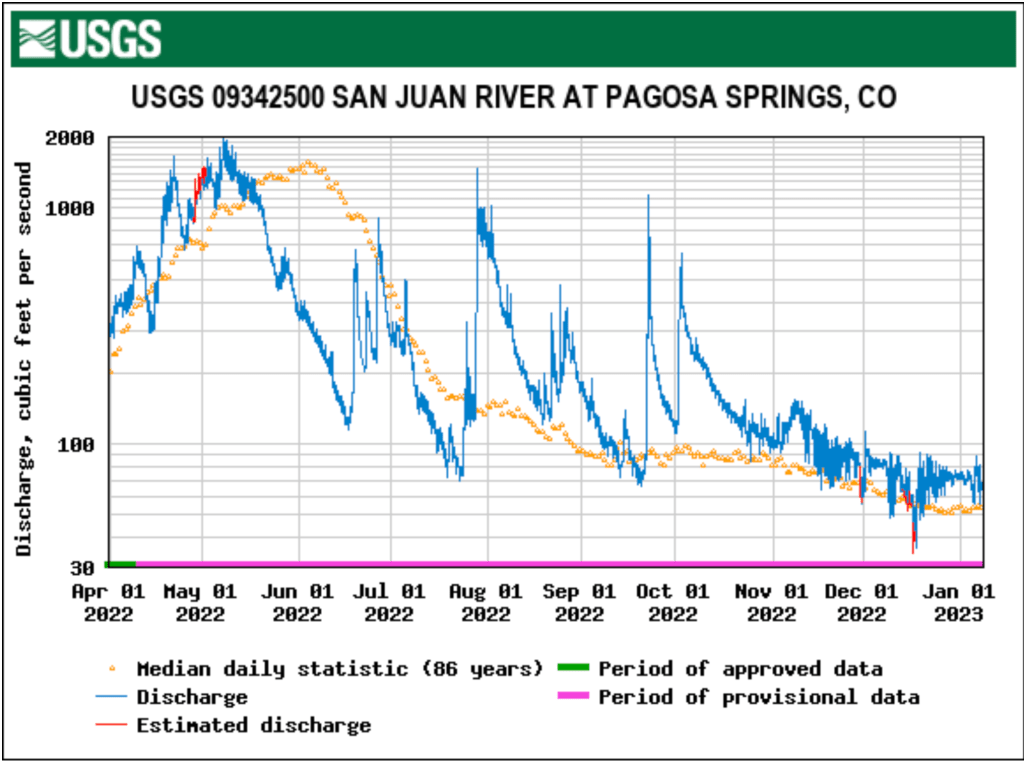 Stream flow for the San Juan River at approximately 10 a.m. on Jan. 4 was 73.8 cubic feet per second (cfs), according to the U.S. Geological Service National Water Dashboard. This reading is up slightly from last week’s reading of 72.5 cfs at 10 a.m. on Dec. 28, 2022.