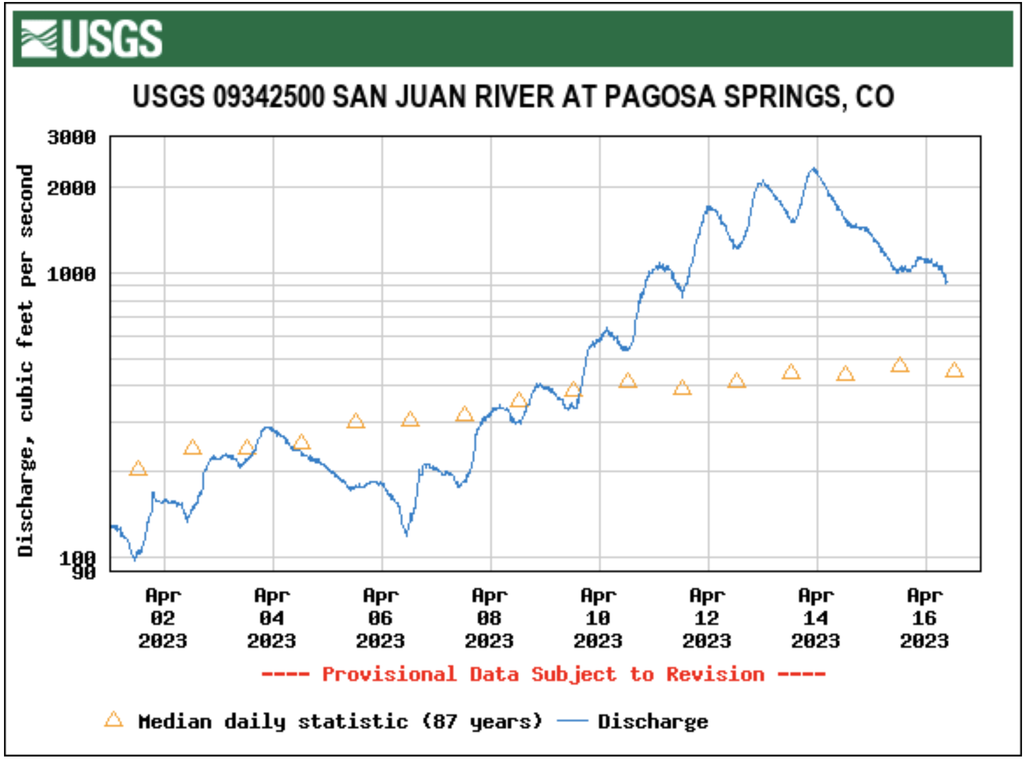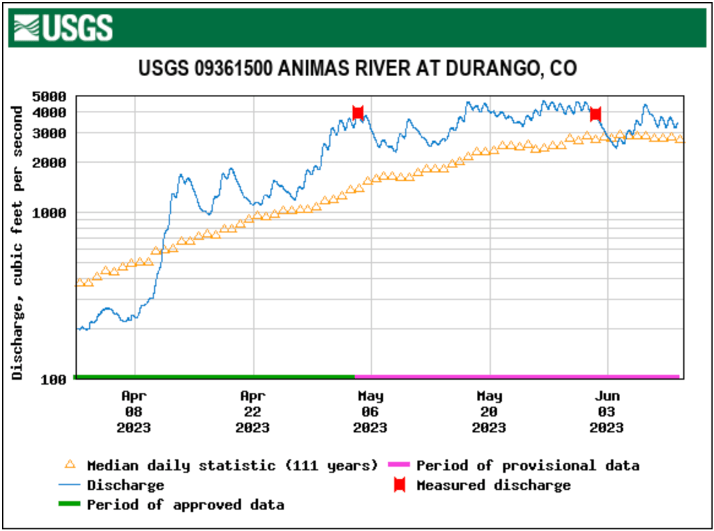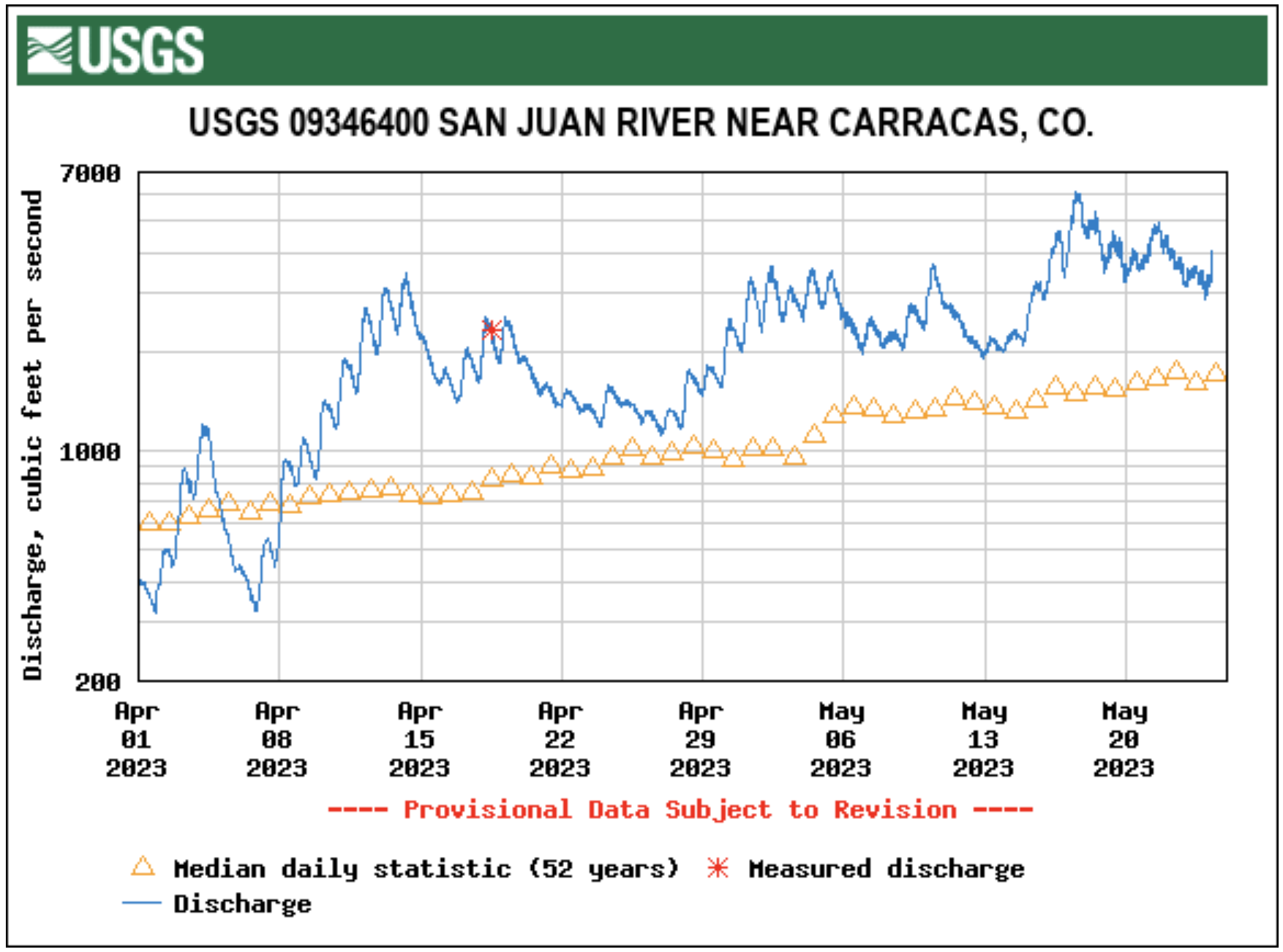Area rivers also remain high, with the San Juan River in Pagosa Springs running at 2,470 cubic feet per second (cfs) at 9 a.m. on June 7, down from a nighttime peak of 2,930 cfs at 2 a.m., according to data from the U.S. Geological Survey (USGS). The mean flow for June 7 is 1,550 cfs, while last year’s flow on the date was 1,100 cfs, according to the USGS. The San Juan River has remained consistently above the median flow for the last 30 days, only briefly dipping below the median on June 4.