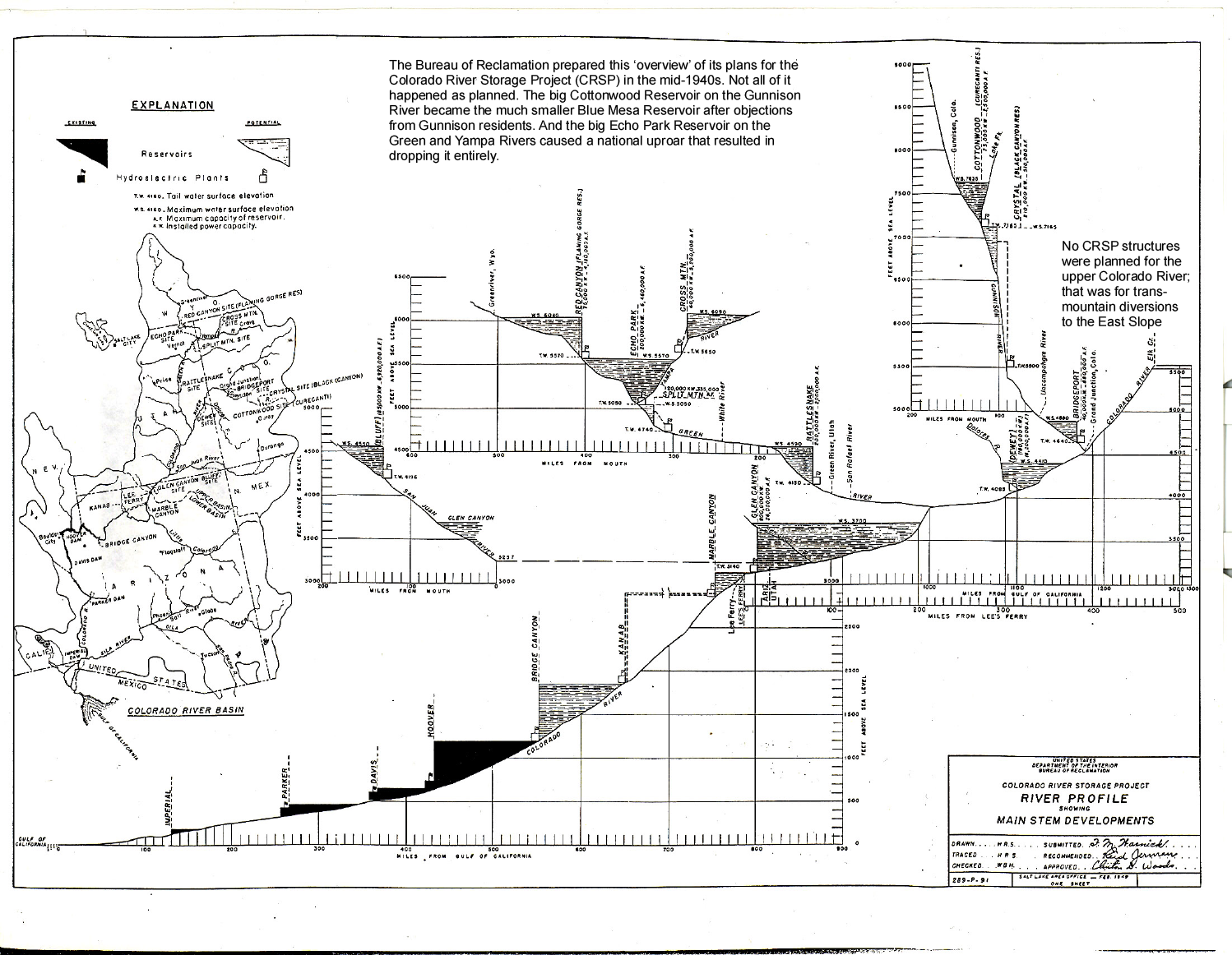 The Bureau of Reclamation prepared this ‘overview’ of its Colorado River Storage Project (CRSP) in the mid-1940s. Not all of it happened as planned. The big Cottonwood Reservoir on the Gunnison River became the much smaller Blue Mesa Reservoir after objections from Gunnison residents. And the big Echo Park Reservoir on the Green and Yampa Rivers caused a national uproar that resulted in dropping it entirely. Credit: USBR (Click to enlarge)