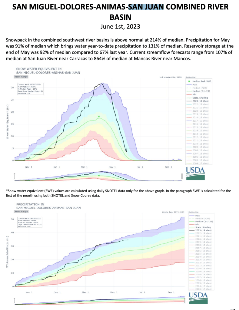 River levels across the region remain above average while the snowpack on Wolf Creek Pass was 79 percent of median as of June 7, according to the U.S. Department of Agriculture (USDA) National Water and Climate Center’s snowpack report. The USDA report indicates that the pass had 10.9 inches of snow water equivalent on Wednesday, June 7, below the median of 13.8 inches.
