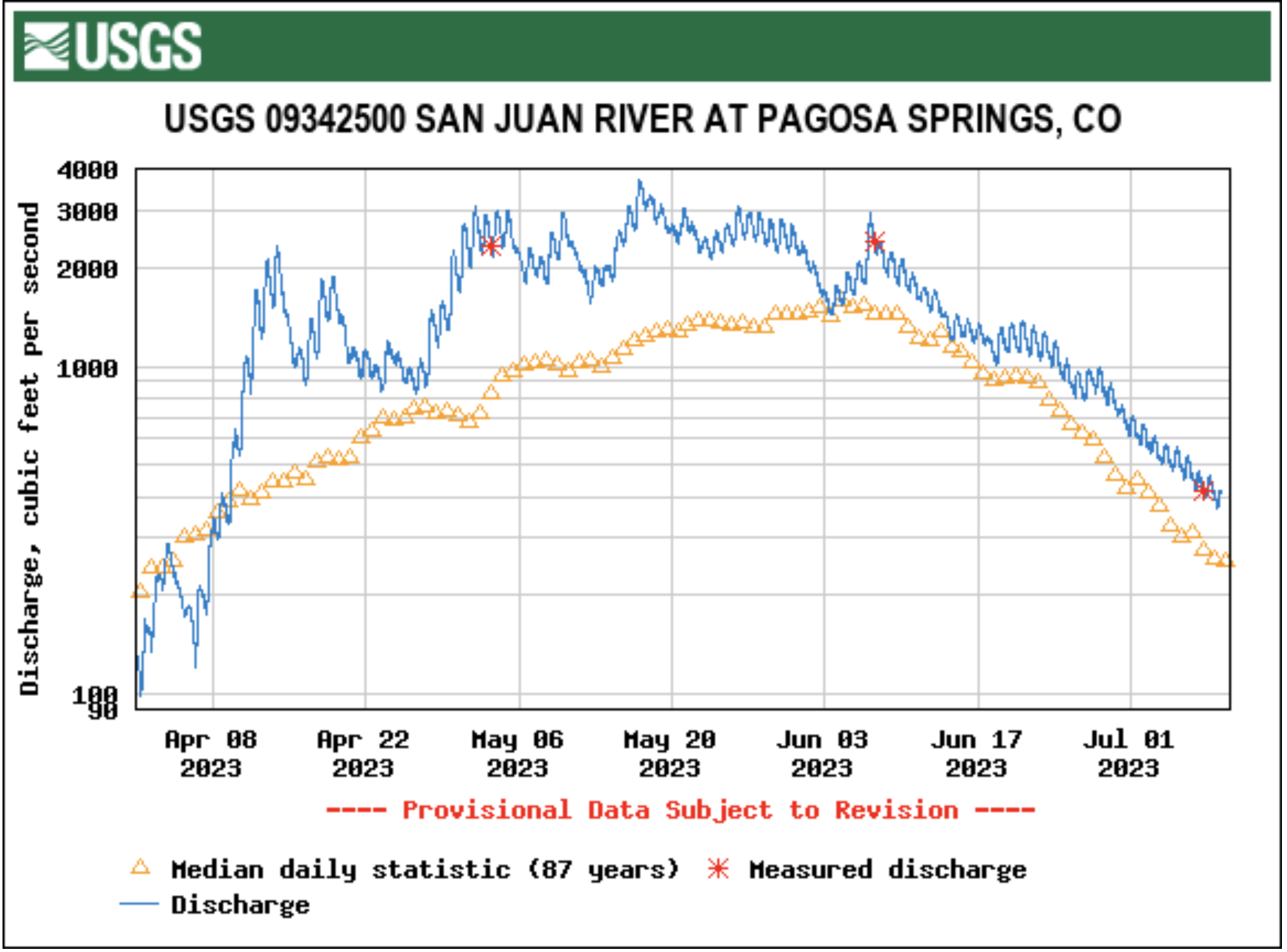 Flow levels in the San Juan River continued to drop this week, though they remain above median. The San Juan River in Pagosa Springs was running at 513 cubic feet per second (cfs) at 9 a.m. on July 5, down from a nighttime peak of 565 cfs at 3:15 a.m., according to data from the U.S. Geological Survey (USGS). The median flows for July 5, based on 87 years of data, are 301 cfs, according to the USGS. These flows are down from June 28 when, according to USGS, the river was flowing at 863 cfs at 9 a.m., down from a nighttime peak of 986 cfs at 1:15 a.m. The San Juan River has remained consistently above the median flow for the last 30 days, only briefly dipping below the median on June 4…