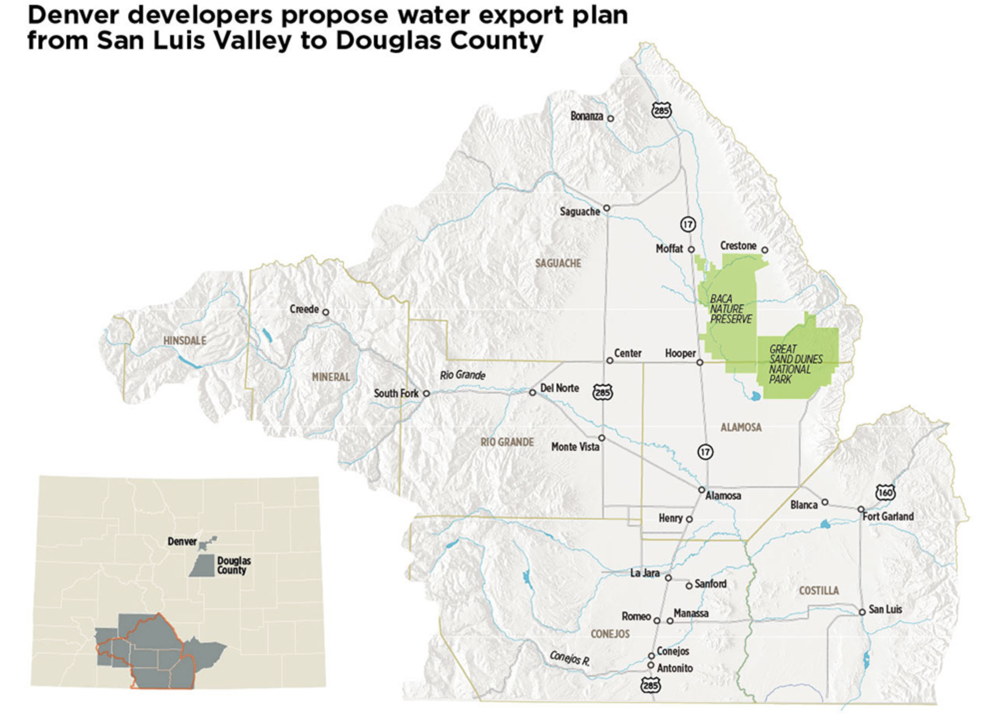 The plan Douglas County has been reviewing would pump 22,000-acre feet a year from the northern end of the Valley in Saguache County and Subdistrict 4 of the Rio Grande Water Conservation District.