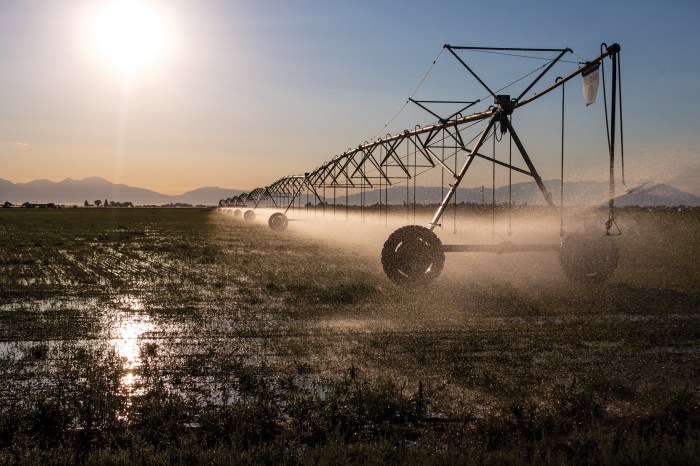 A powerful sprinkler capable of pumping more than 2,500 gallons of water per minute irrigates a farm field in the San Luis Valley June 6, 2019. Credit: Jerd Smith via Water Education Colorado