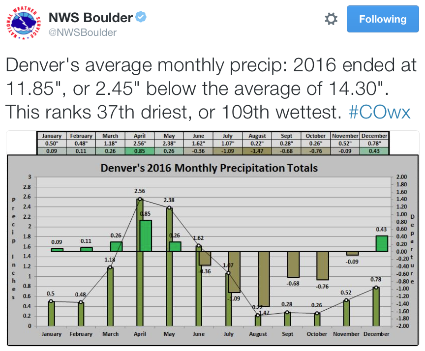 As 2016 draws to a close, the yearlong precipitation level is lower than in 2015 but not far off from the average annual precipitation.