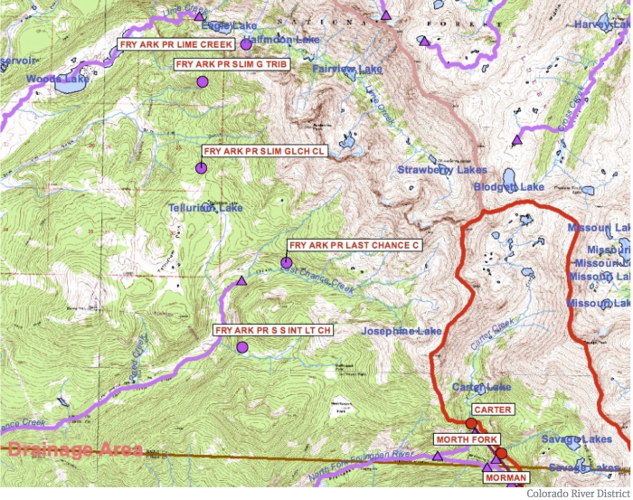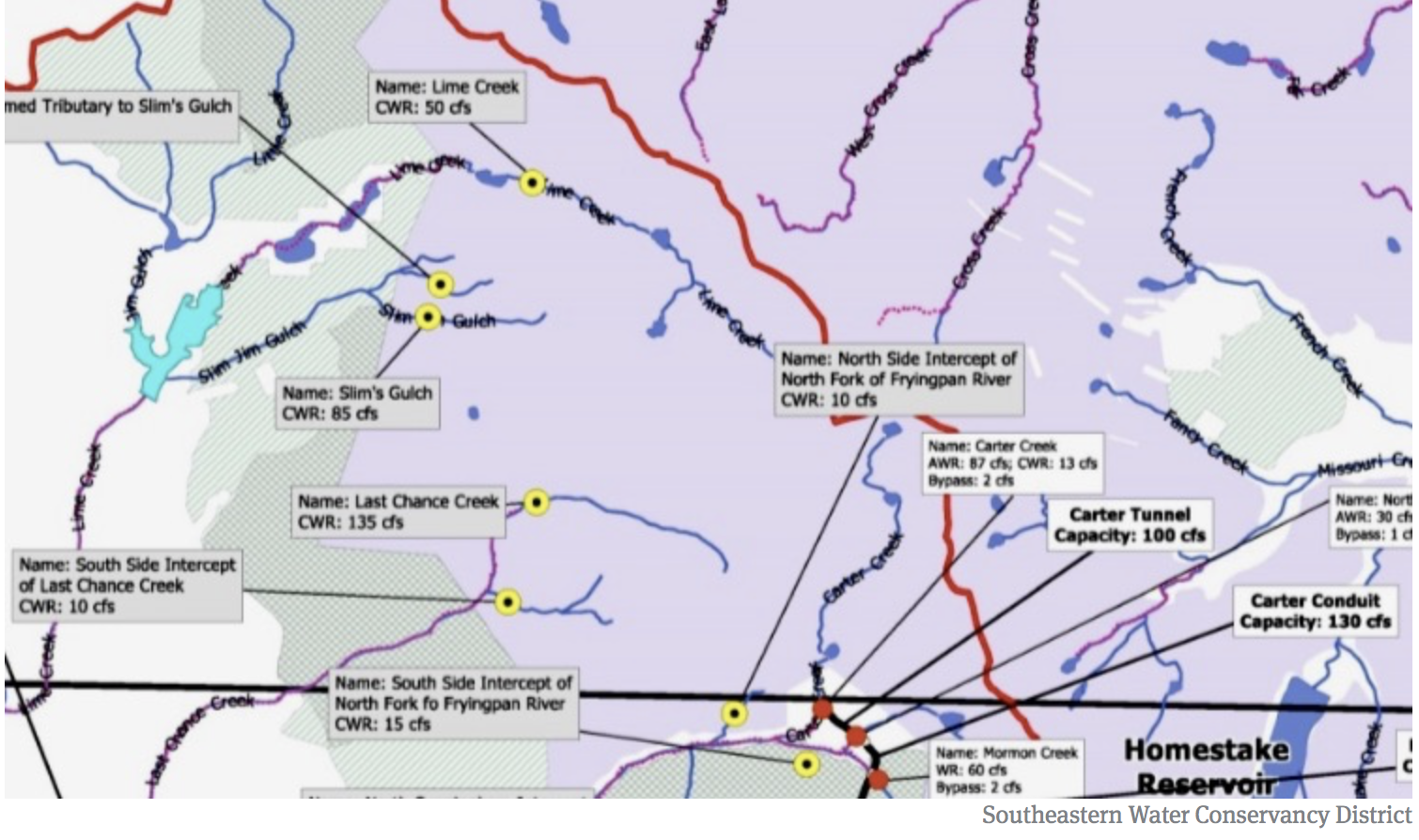A map filed as part of Southeastern’s diligence application that shows the extent of the Fry-Ark Project. On its southern end, it diverts water from creeks near Aspen. The conditional rights within the Holy Cross Wilderness are on its northern end.
