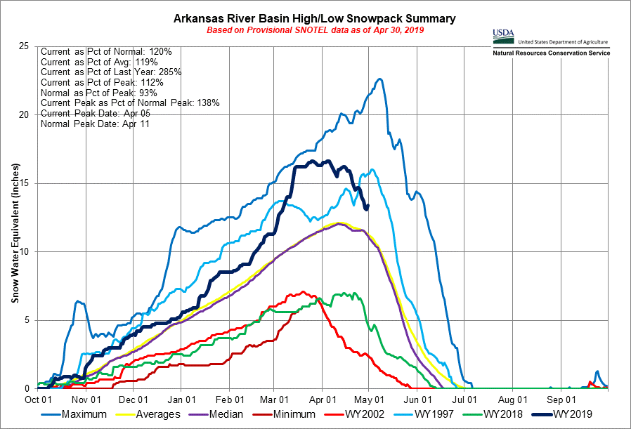 As of Friday, the Arkansas basin’s moisture content was at 115 percent of average, and the Rio Grande basin was at 106 percent of average.