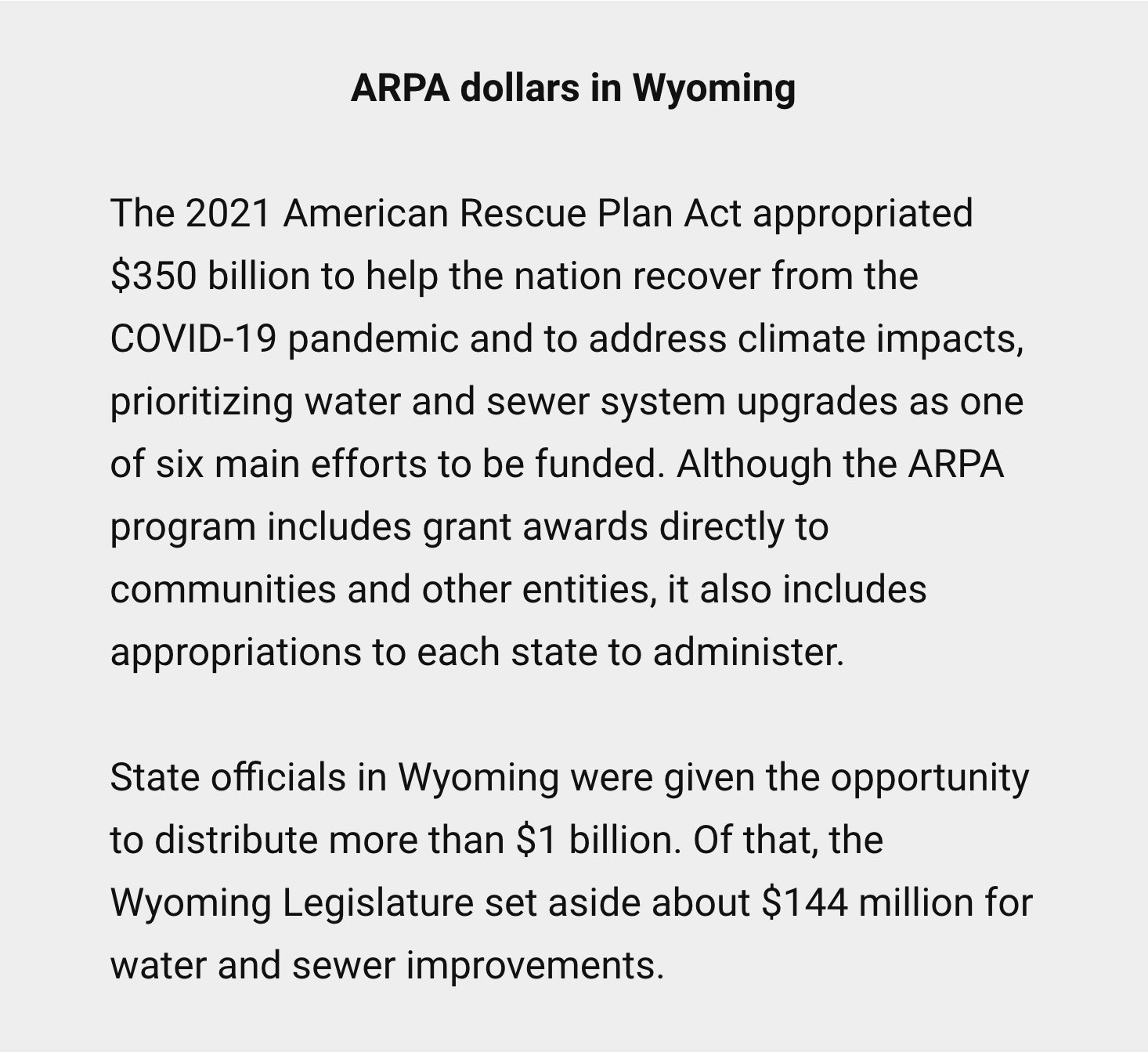According to the release, “[a]ll levels of infrastructure have seen increased demands during the pandemic, and our water and wastewater infrastructures are no exception. This $20 million allocation will help El Paso County preserve and be better stewards of our most precious and scarce resource, and is an investment directly allowed under ARPA guidance.”