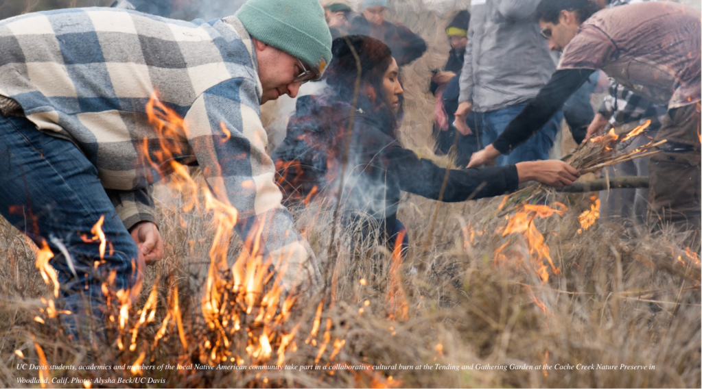 UC Davis students, academics and members of the local Native American community take part in a collaborative cultural burn at the Tending and Gathering Garden at the Cache Creek Nature Preserve in Woodland, Calif. Photo: Alysha Beck/UC Davis