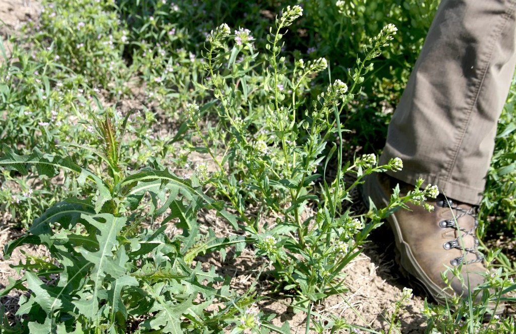 Oftentimes the first plants that emerge from treated, plowed and seeded hayfields in Grand Teton National Park arenโt the desired species. Instead, non-native plants like prickly lettuce and pennycress can dominate during the early years of sagebrush restoration. (Mike Koshmrl/WyoFile)