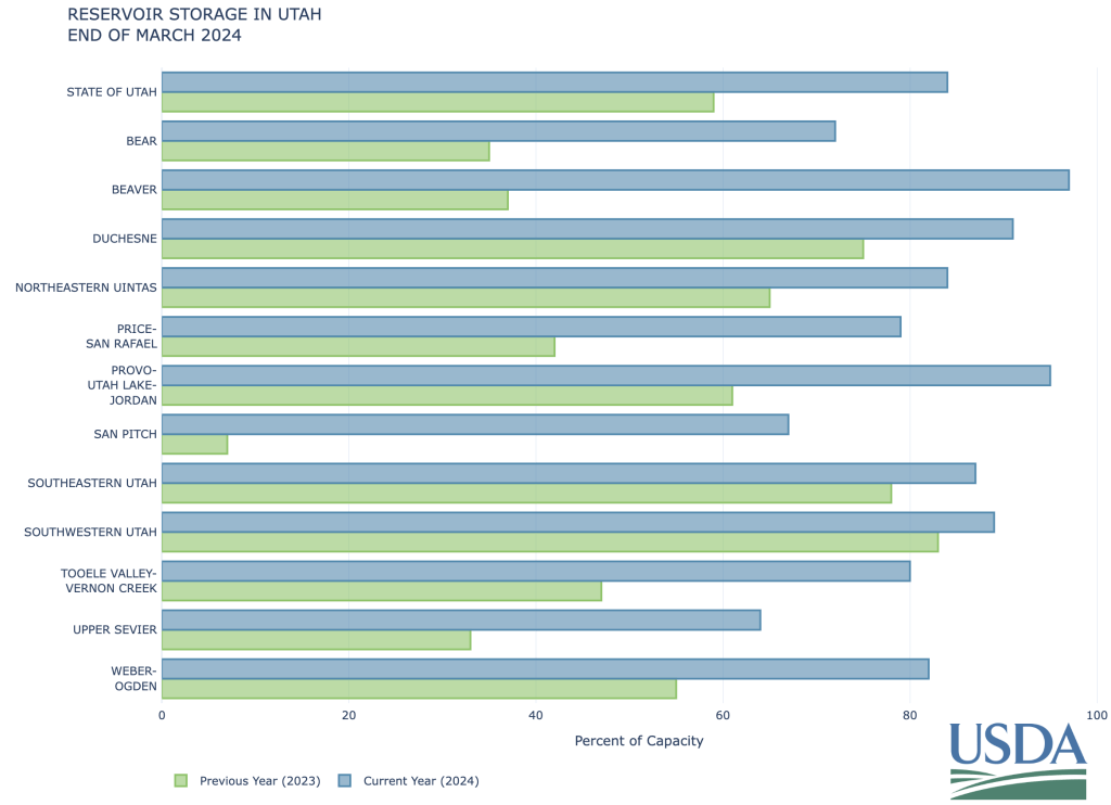 The Utah Division of Water Resources on Thursday reported the stateโs reservoirs at about 85% capacity, which officials say is โimpressiveโ for this time of year. The announcement comes on the heels of an above average winter, with Utah seeing about 132% of the normal snow water equivalent โ essentially how much water is in the snowpack โ at the beginning of April.