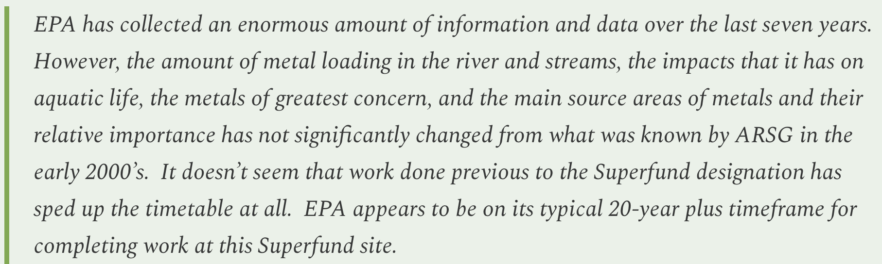 A lot of folks, myself included, hoped that the Superfund cleanup would incorporate ARSG as an active partner and build upon their efforts. Just imagine what the group, which was formed in 1994 and included a vast storehouse of water quality data and analysis and human expertise, could have done with EPA funding and liability protection? Instead, the EPA started virtually from scratch. The ARSG ultimately disbanded and was replaced by the citizens advisory group, or CAG. Former ARSG Coordinator Peter Butler was brought on as CAG’s chair.
