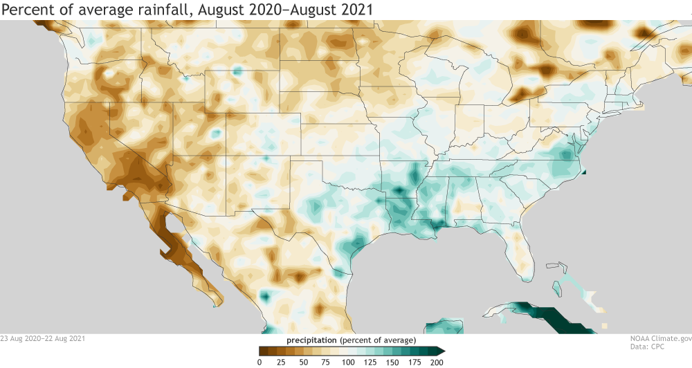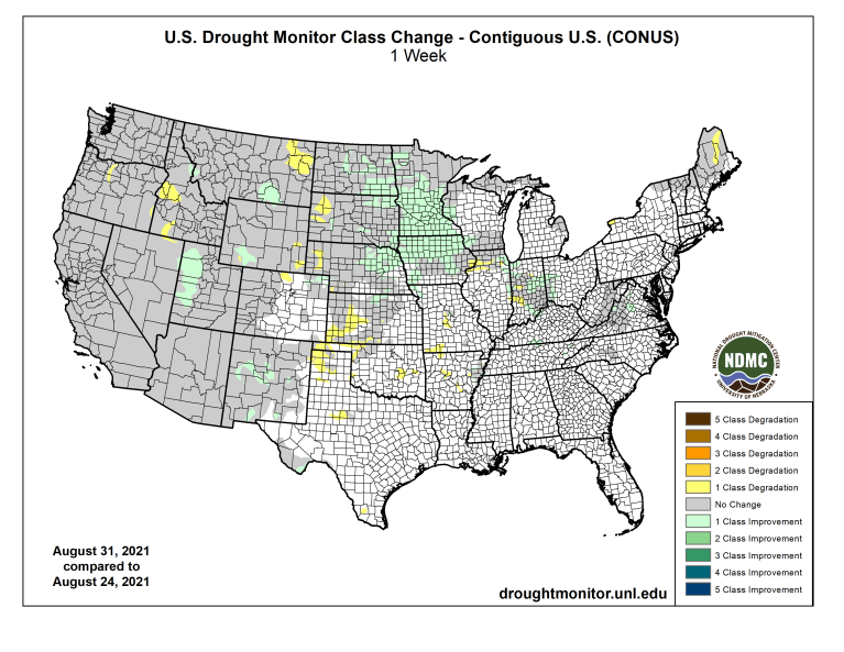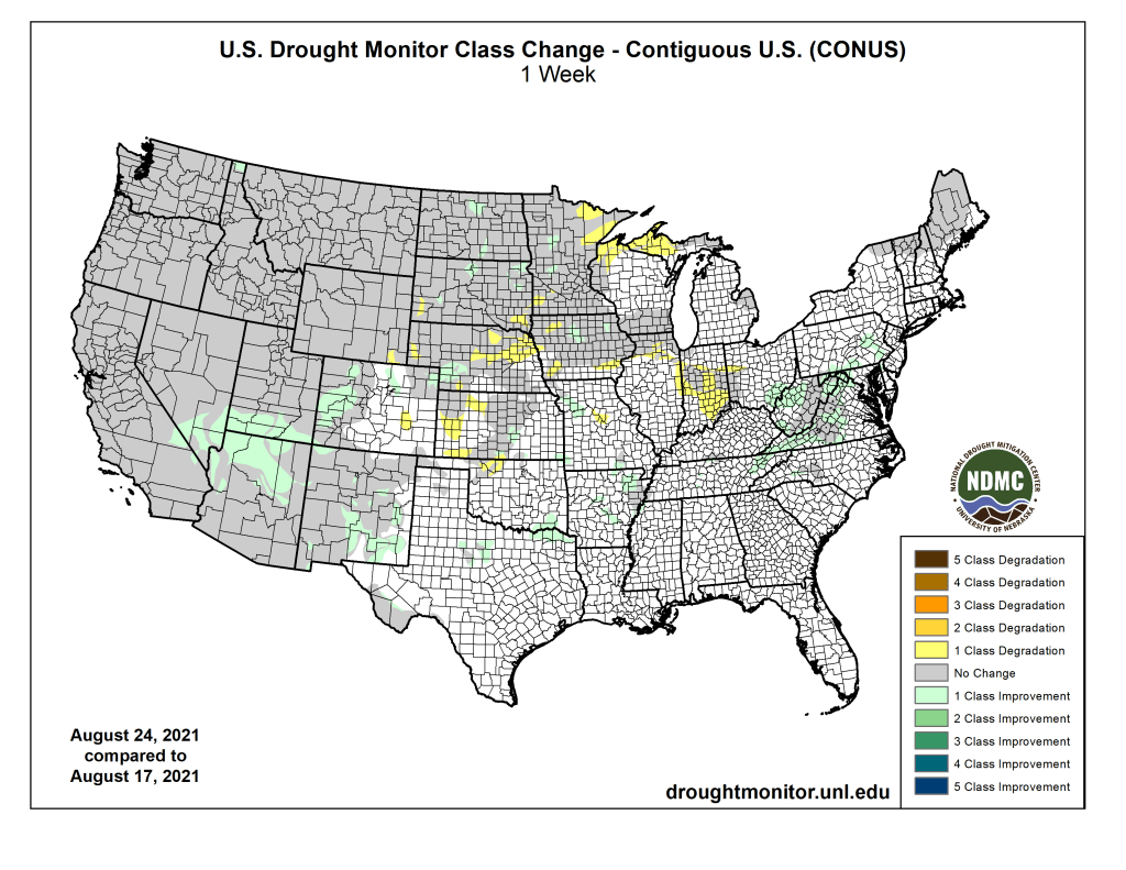 Winter wheat seeding in Kansas was expected to begin in mid-September. Conditions there were favorable with only 15% of winter wheat expected to be planted in areas experiencing drought (2% severe and 13% moderate), according to the USDA’s analysis of the Aug. 24 US Drought Monitor. There currently were no drought concerns for Texas and Oklahoma. Farther north, though, conditions were much drier. Forty-four percent of Nebraska wheat cropland was in drought (18% severe and 26% moderate). Drought gripped 99% of South Dakota winter wheat cropland (23% extreme, 59% severe and 17% moderate), and all Montana winter wheat cropland (3% exceptional, 33% extreme, 57% severe and 6% moderate).