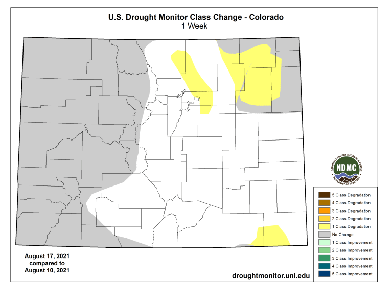 Colorado Drought Monitor one week change map ending August 24, 2021.