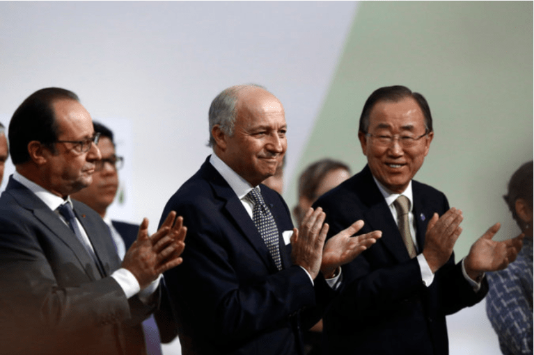 From left, President François Hollande of France; Laurent Fabius, the French foreign minister; and United Nations Secretary General Ban Ki-moon during the climate change conference [December 2015] in Le Bourget, near Paris. (Credit Francois Mori/Associated Press)