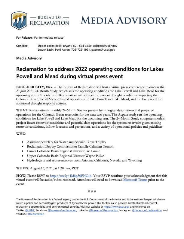 The Bureau of Reclamation today released the Colorado River Basin August 2021 24-Month Study. This month’s study projections are used to set annual operations for Lake Powell and Lake Mead in 2022. Releases from these massive reservoirs are determined by anticipated reservoir elevations.