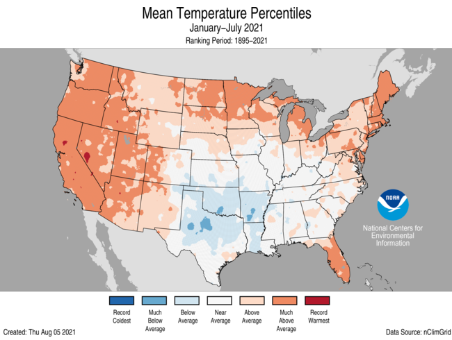 January-July temperatures were above average across the West, northern and central Plains, Great Lakes, Northeast, mid-Atlantic and portions of the Southeast. California, Oregon and Nevada each had their fourth-warmest year-to-date period on record with 11 additional states across the West, northern Plains, Northeast and Southeast experiencing a top-10 warmest January-July.