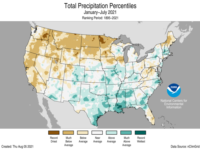 The July precipitation total for the contiguous U.S. was 3.36 inches, 0.58 inch above average, and sixth-wettest in the 127-year period of record. The year-to-date precipitation total for the Lower 48 was 18.00 inches, 0.09 inch below average, ranking in the middle one-third of the historical record.