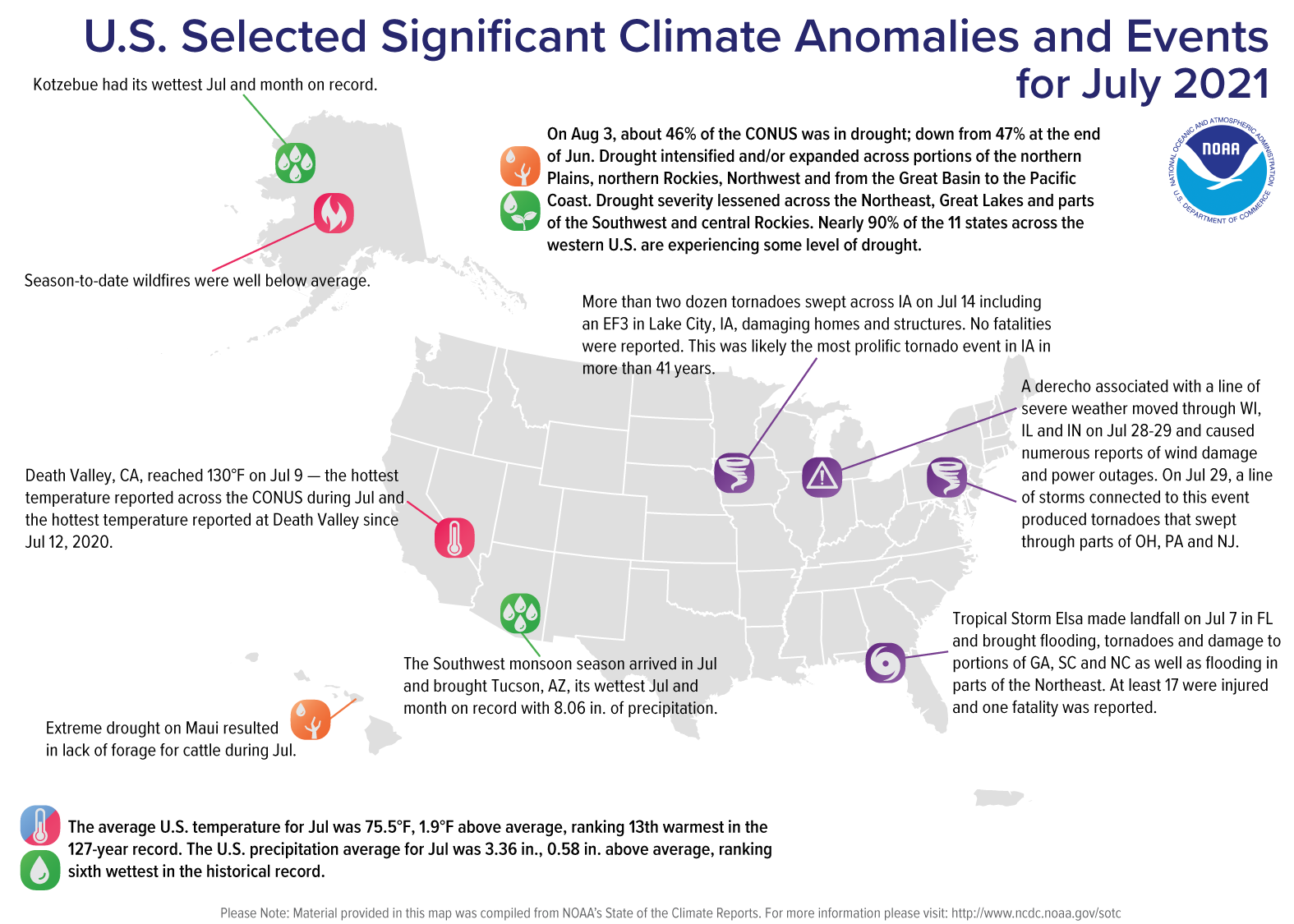 The July 2021 contiguous U.S. temperature was 75.5°F, 1.9°F above the 20th-century average, tying with 1954 and 2003 for 13th warmest in the 127-year record. For the year-to-date, the national temperature was 53.0°F, 1.8°F above average, ranking 14th warmest on record.