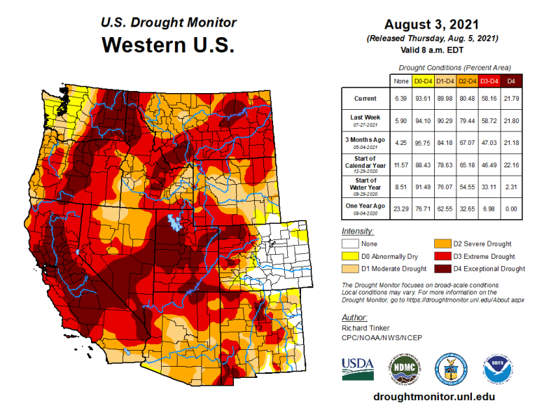 According to the August 3 U.S. Drought Monitor, approximately 46 percent of the contiguous U.S. was in drought, down from about 47 percent at the end of June. Drought intensified and/or expanded across portions of the northern Plains, northern Rockies, Northwest and from the Great Basin to the Pacific Coast.