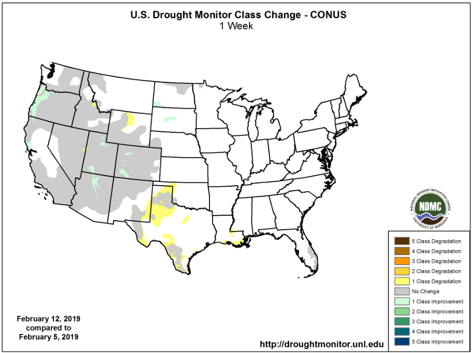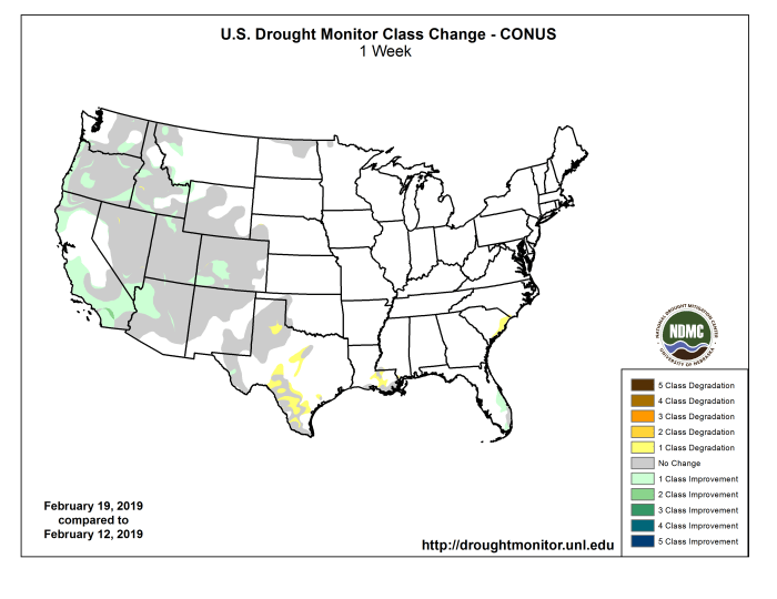 US Drought Monitor one week change map through February 19, 2019.
