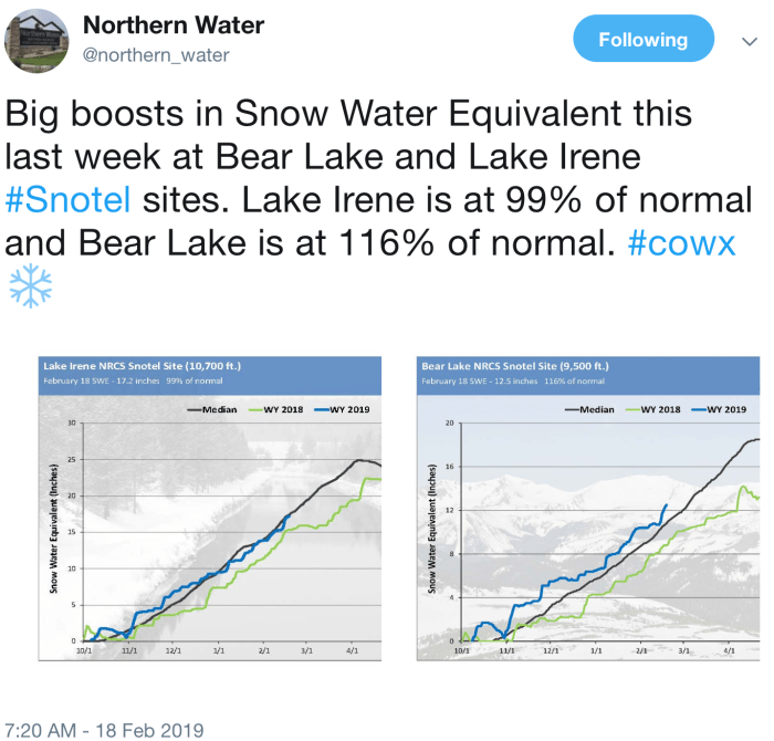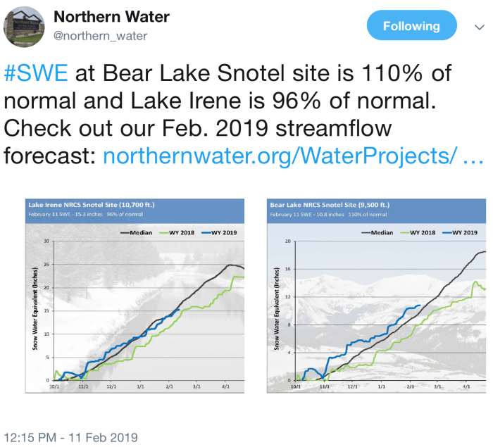 According to the most recent NRCS Water Supply Outlook report, “Water year 2019 got off to a great start with all major basins receiving above average precipitation in October. This ranged from a low of 109 percent of average in the combined Yampa, White, and North Platte basins to a high of 144 percent in the combined San Miguel, Dolores, Animas, and San Juan basins of Southwest Colorado. November precipitation displayed notable differences between the northern and southern parts of the state. Northern Colorado continued to receive well above average precipitation …”