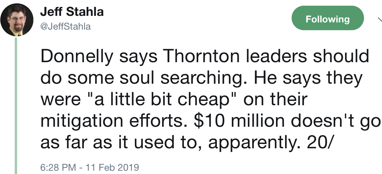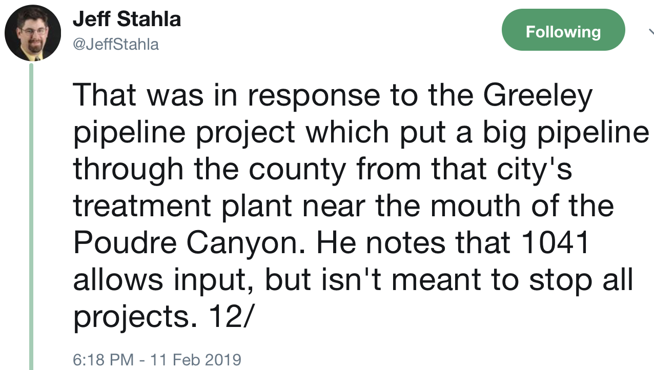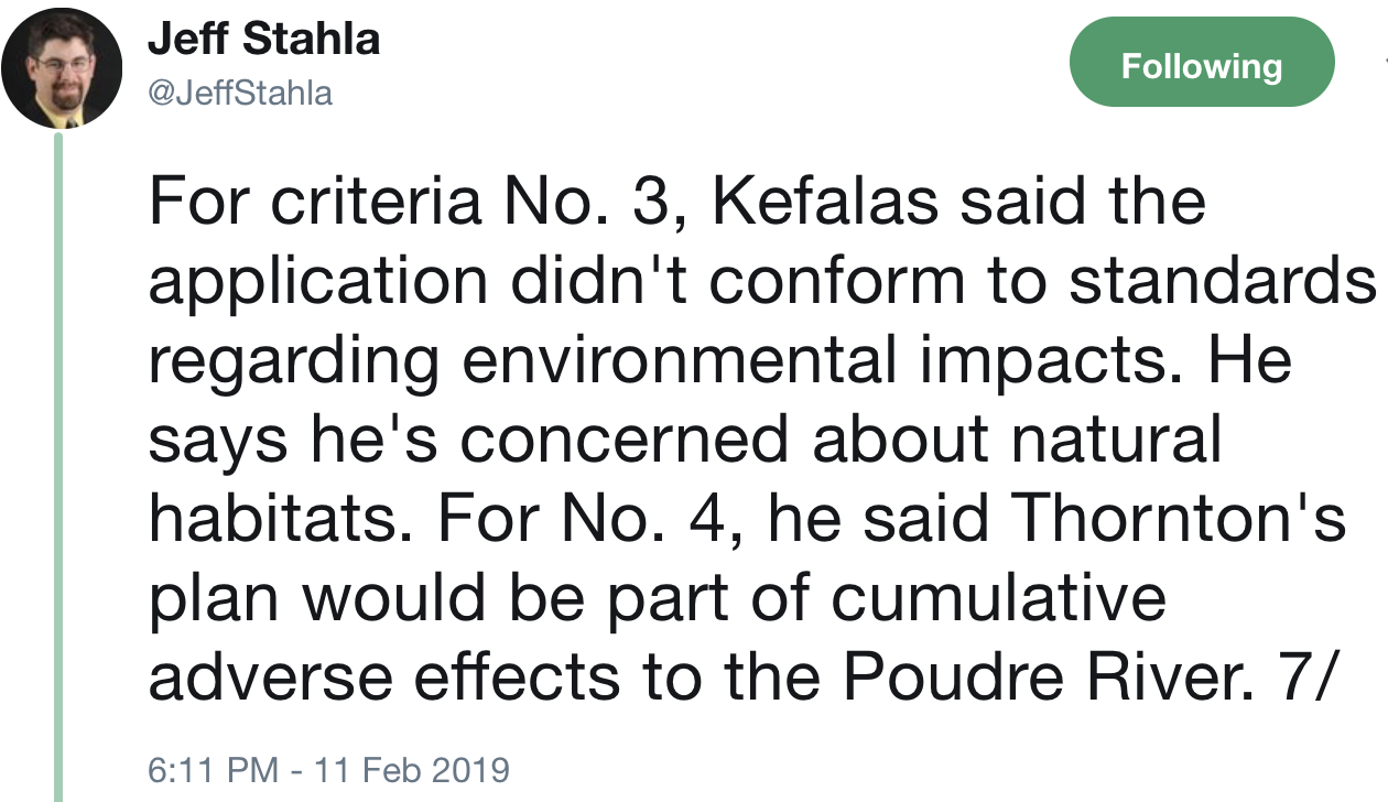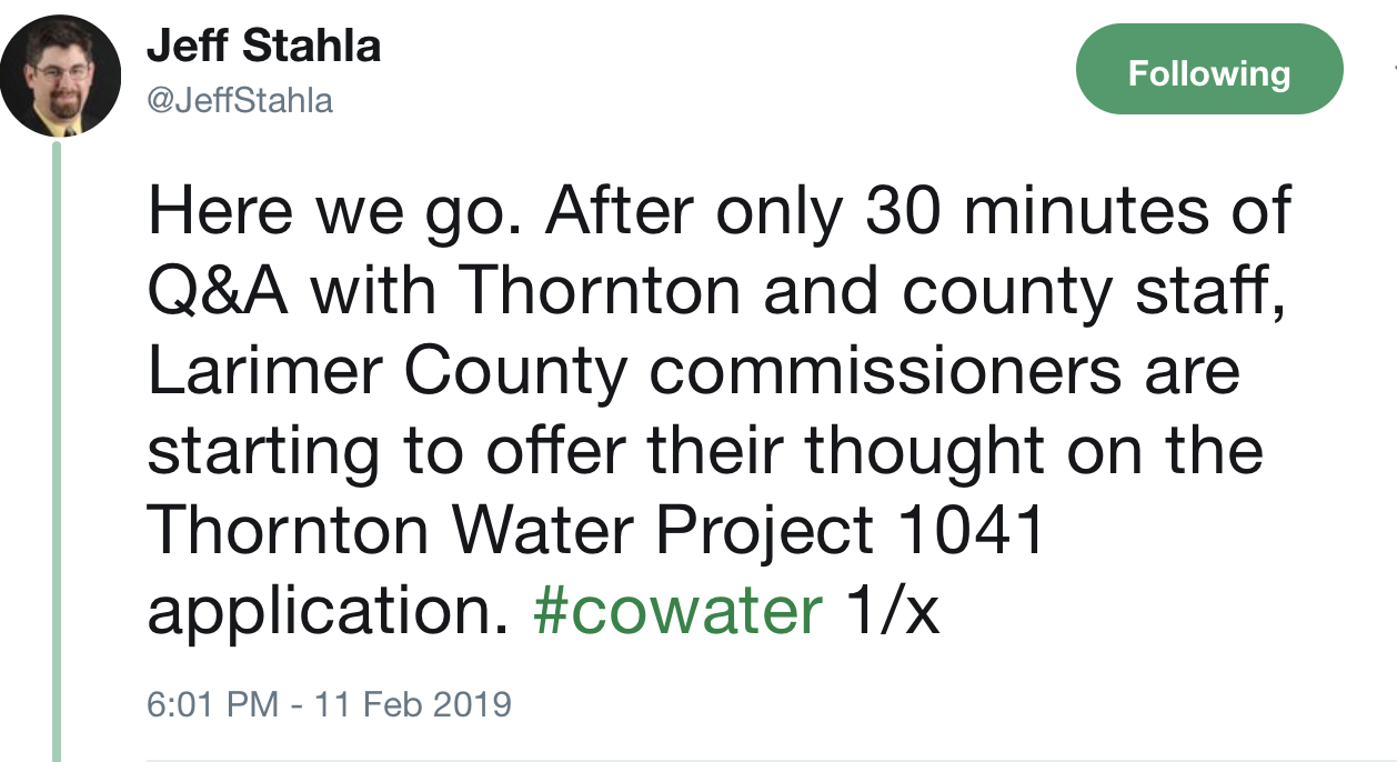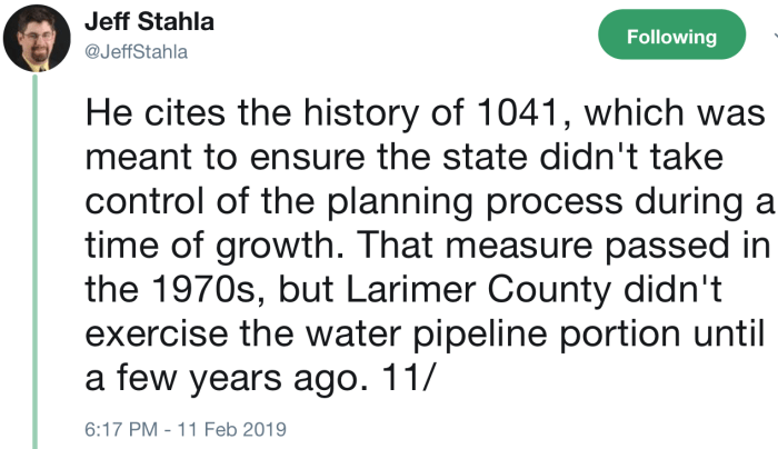 “It is disappointing that the Larimer County Commissioners chose to ignore the recommendations of their own county staff that Thornton met all of the 1041 criteria for a water pipeline to be built in the county, potentially causing a delay in Thornton residents’ access to the clean water resources they own,” Thornton Water Project Director Mark Koleber said in a statement provided by Thornton Water Project spokesman Cody Wertz. “In the coming days and weeks, we will review the decision and determine our next steps.”
