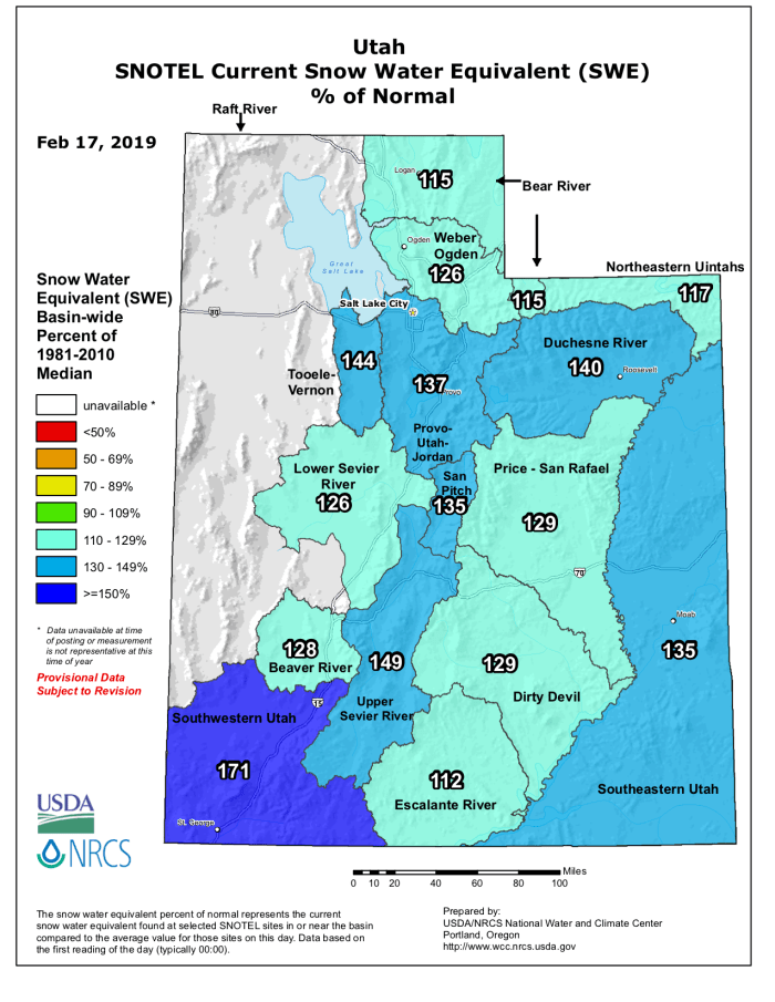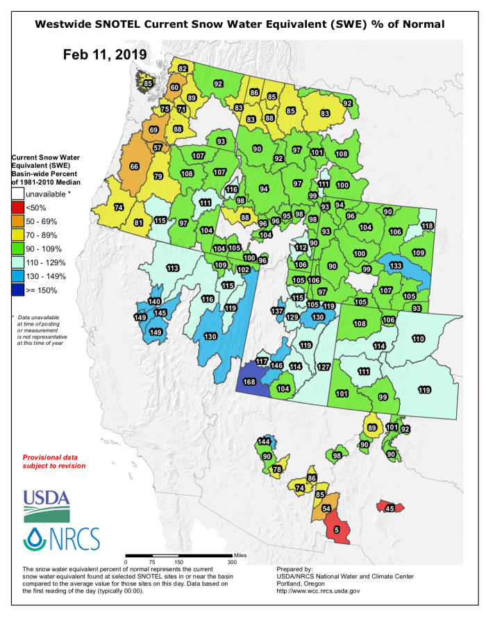Westwide SNOTEL basin-filled map February 11, 2019 via the NRCS.