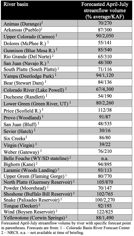 April 1 water supply forecasts across the CRB and GB are generally below to well below normal and summarized in the figure and table below. Snowpack, soil moisture, and future weather are the primary hydrologic conditions that impact the water supply outlook.