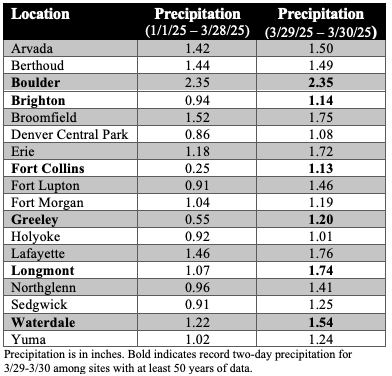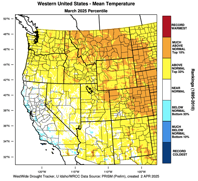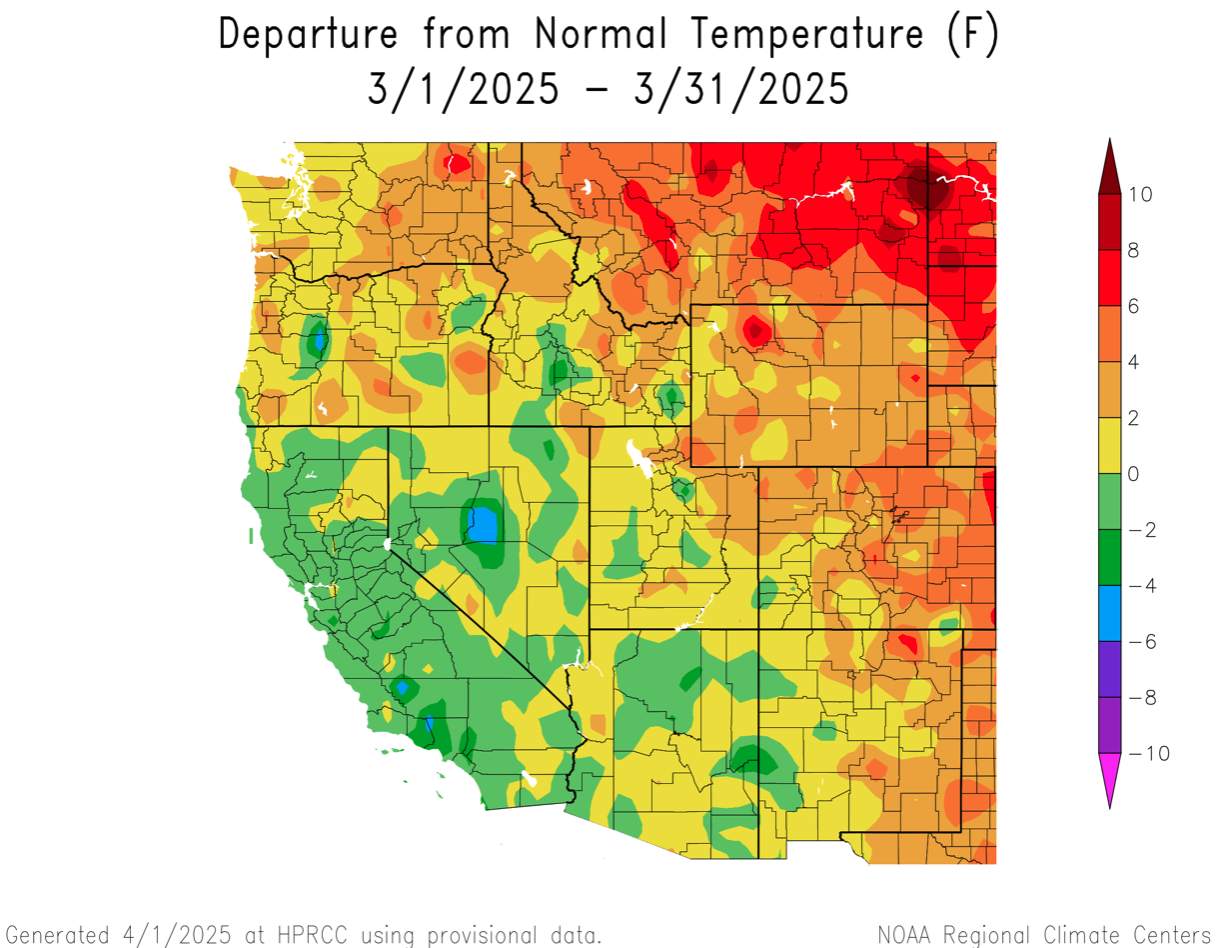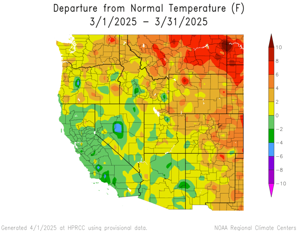 Toward the end of the month, a strong ridge of high pressure resulted in well above normal temperatures for the region. Numerous record high maximum and minimum temperatures were observed. This period of warm, sunny weather led to snowmelt in many lower and middle elevation locations. A cold storm system arrived during the final days of the month that reduced snowmelt rates and brought additional snow to higher elevations.