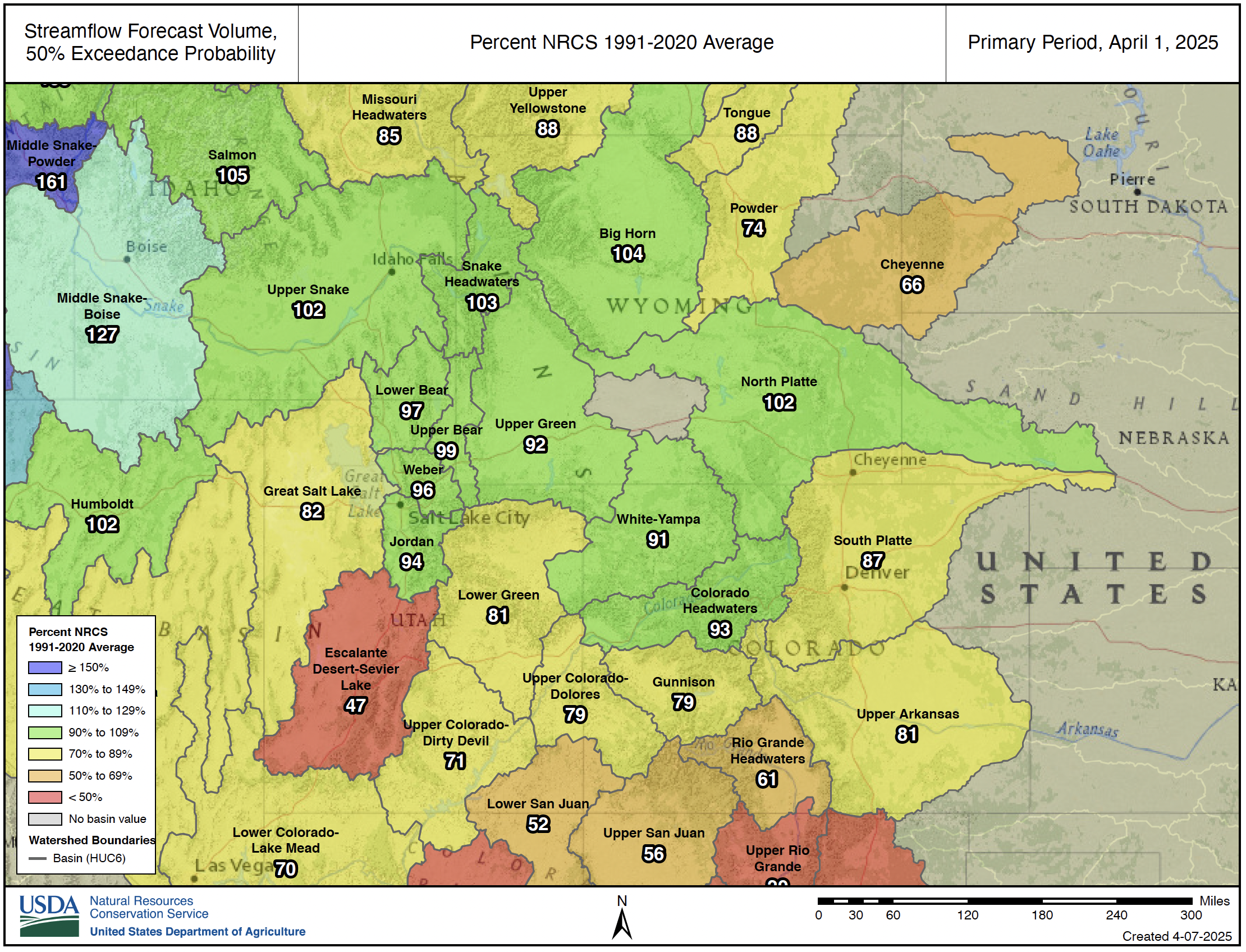 Snow water equivalent as a percent of the 1991-2020 median for the major river basins in Colorado as of April 12, 2025. Source: USDA/NRCS interactive map.