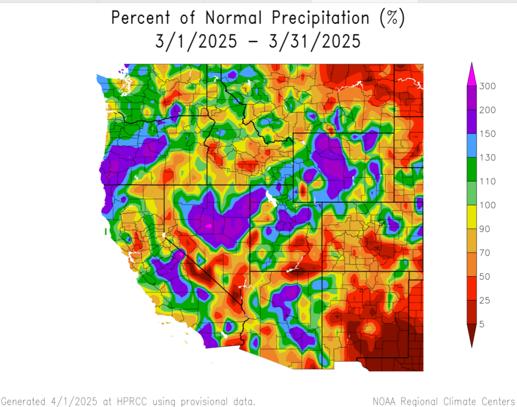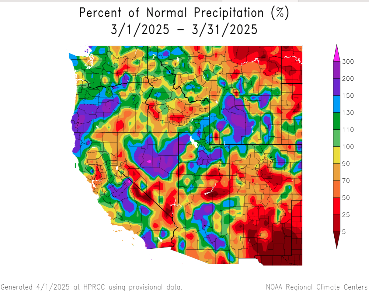 March brought stretches of both active and quiet weather for the CBRFC area. Overall, conditions were neither extremely wet nor extremely dry, and most of the significant runoff areas ended the month within 30% of average March precipitation. Generally, the storm track benefitted the western side of the CBRFC area (mountains of UT and central/western AZ) more than the eastern side. Most of the systems were cold in nature with precipitation falling as snow over the high terrain.