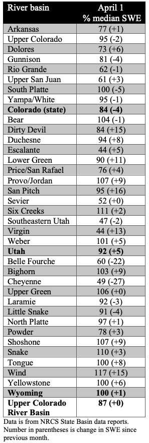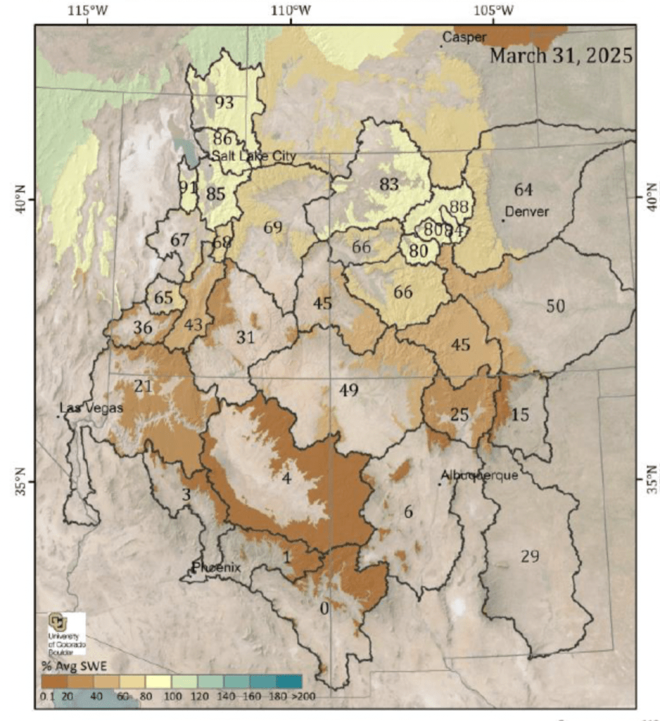 Snow water equivalent (SWE) conditions as a percent of normal remained relatively steady during the past month due to near normal March precipitation. UCRB April 1 SWE conditions range between 60-110% of normal and are most favorable across northern areas including the Upper Green, White/Yampa, and Colorado River headwaters. SWE conditions across southern basins including the Dolores and San Juan are well below normal, with April 1 SWE at several SNOTEL stations ranked in the driest three on record. UCRB April 1 snow covered area is around 103% of the 2001-2024 median <superscript>1</superscript> LCRB SWE conditions this season have been at or near record low across southwest UT, central AZ, and west-central NM as a result of near record dry winter weather. GB April 1 SWE conditions range between 45-105% of normal and generally improve from south to north.