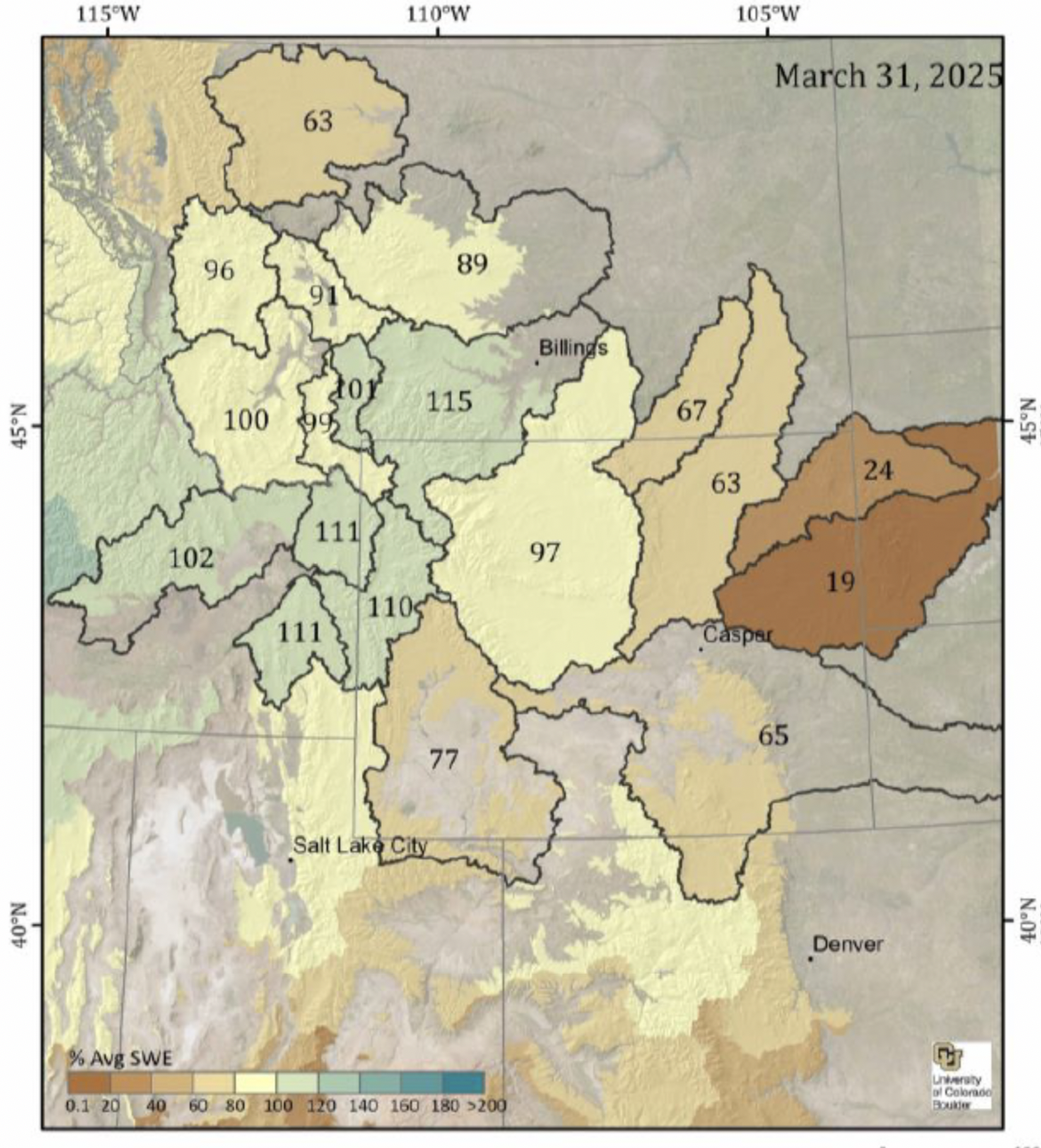 Left: April 1, 2025 SWE – NRCS SNOTEL observed (squares) and CBRFC hydrologic model.