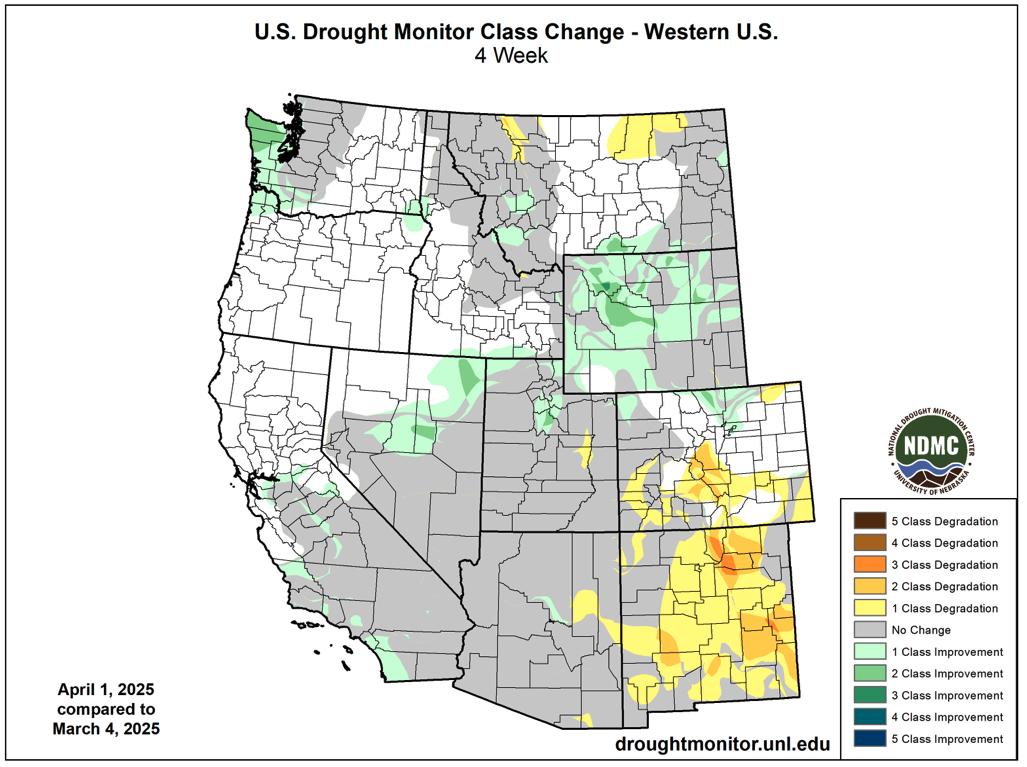 US Drought Monitor one week change map ending April 1, 2025.