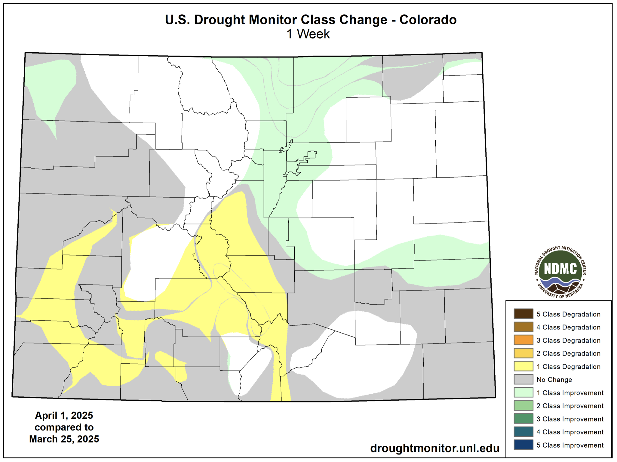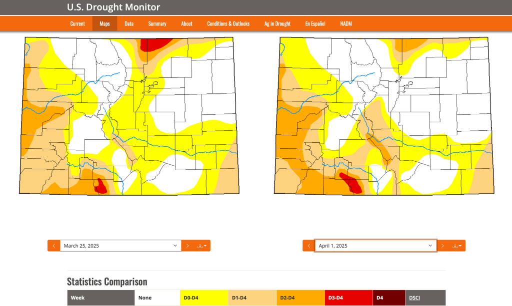 Colorado Drought Monitor one week change map ending April 1, 2025.