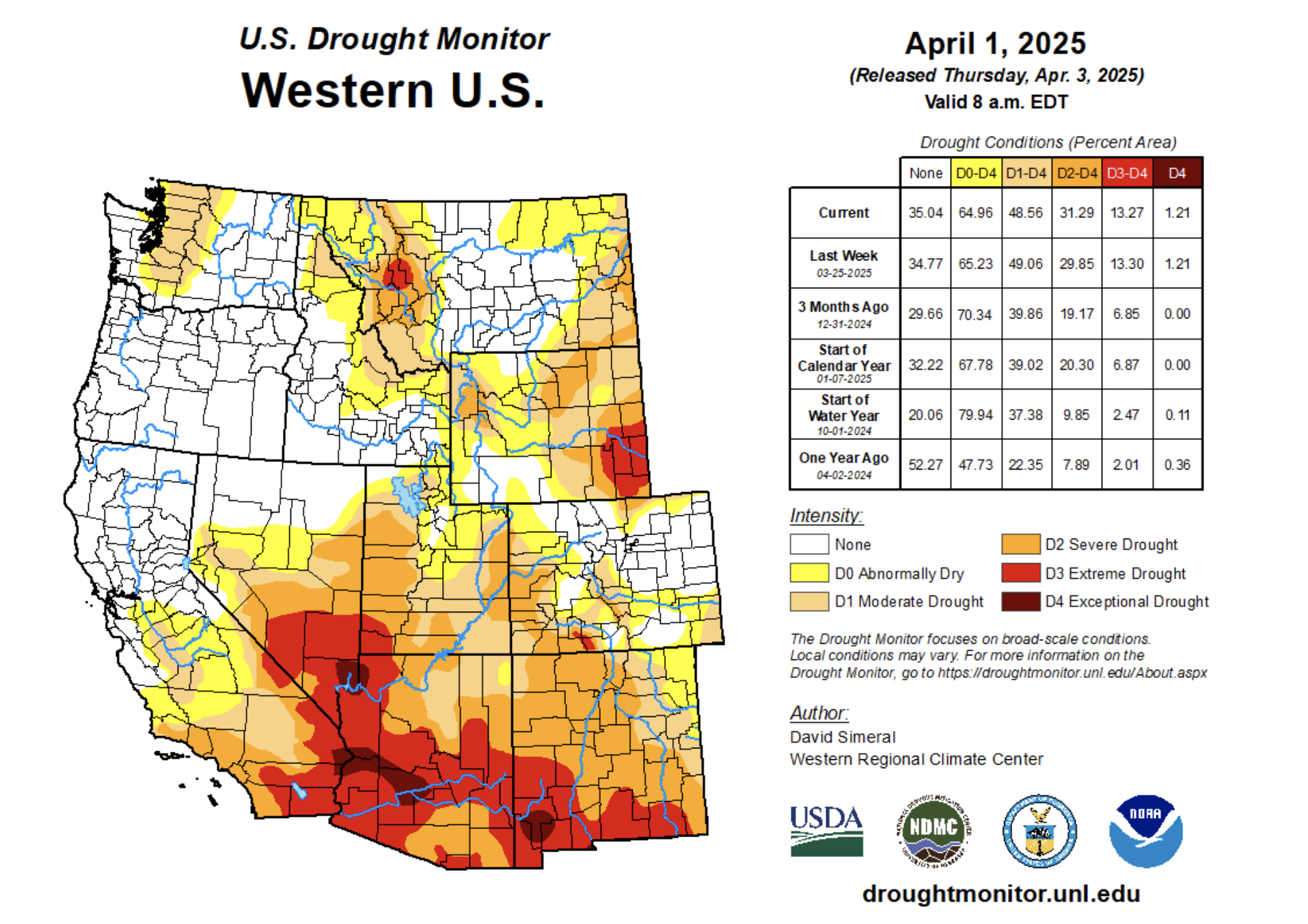 Out West, a series of Pacific storms delivered heavy rain to the lower elevations and snow to the higher elevations of the Pacific Northwest and Northern California. In the Lake Tahoe area, 7-day snowfall totals ranged from 1 to 2+ feet, while areas of the Klamath Mountains of northwestern California received totals up to 3 feet. Other mountain regions, including the Cascades of Oregon, the Wasatch and Uintas of Utah, and the northern Rockies, received accumulations ranging from 6 to 24 inches. Looking at the regional snowpack, the NRCS SNOTEL network is reporting (April 1) the following region-level (2-digit HUC) SWE levels: Pacific Northwest 104%, Missouri 98%, Upper Colorado 89%, Great Basin 103%, Lower Colorado 49%, and Rio Grande 49%. In the Desert Southwest, areas of Extreme Drought (D3) expanded in northeastern and southeastern Arizona in response to very low streamflows and below-normal precipitation since the beginning of the Water Year (Oct 1). In areas of southwestern and south-central Colorado, degradations were made on the map where snowpack conditions at numerous NRCS SNOTEL stations are reporting well below-normal SWE levels. Likewise, poor snowpack conditions have been observed in the mountain ranges of southern Utah, northern Arizona, and northern New Mexico…