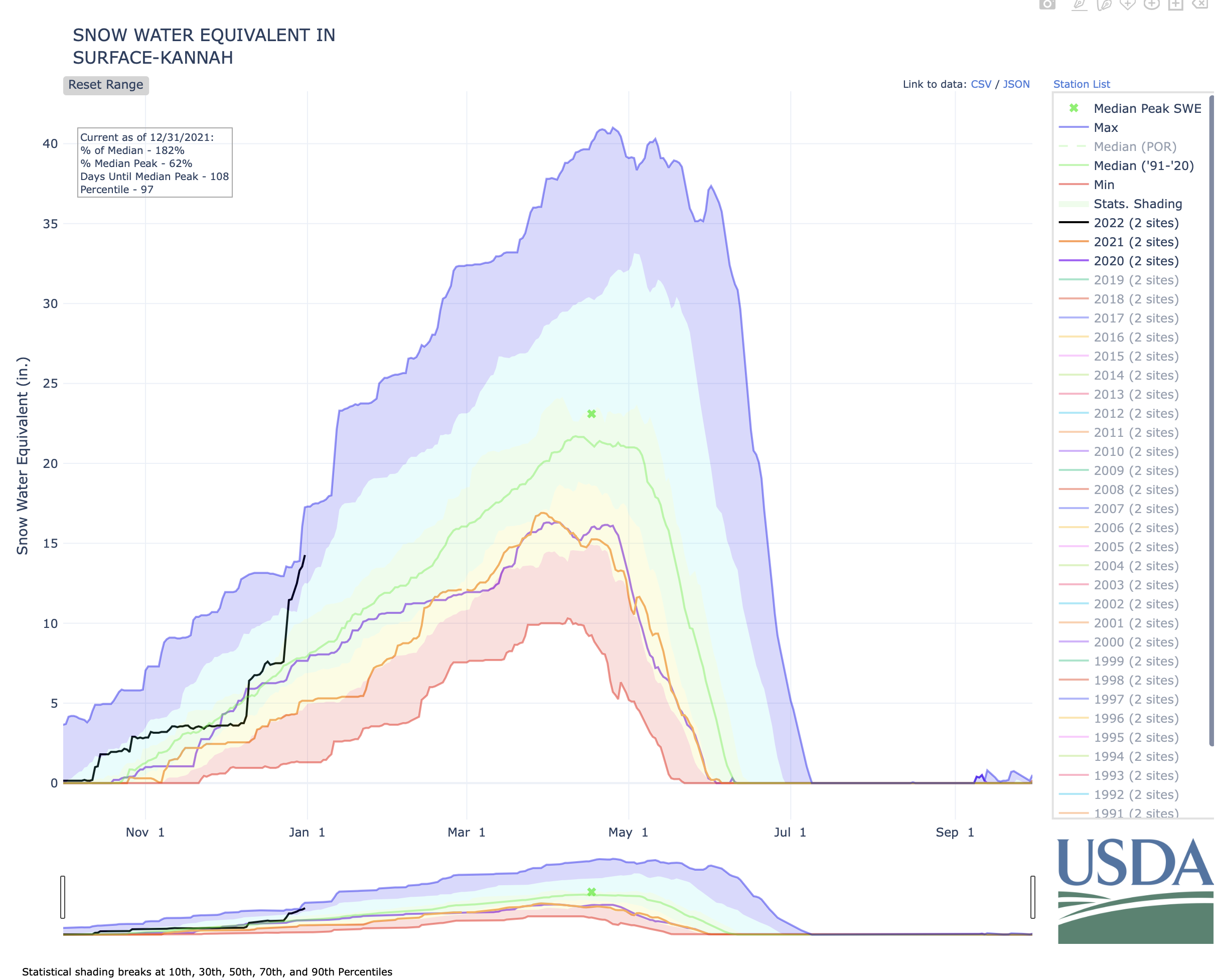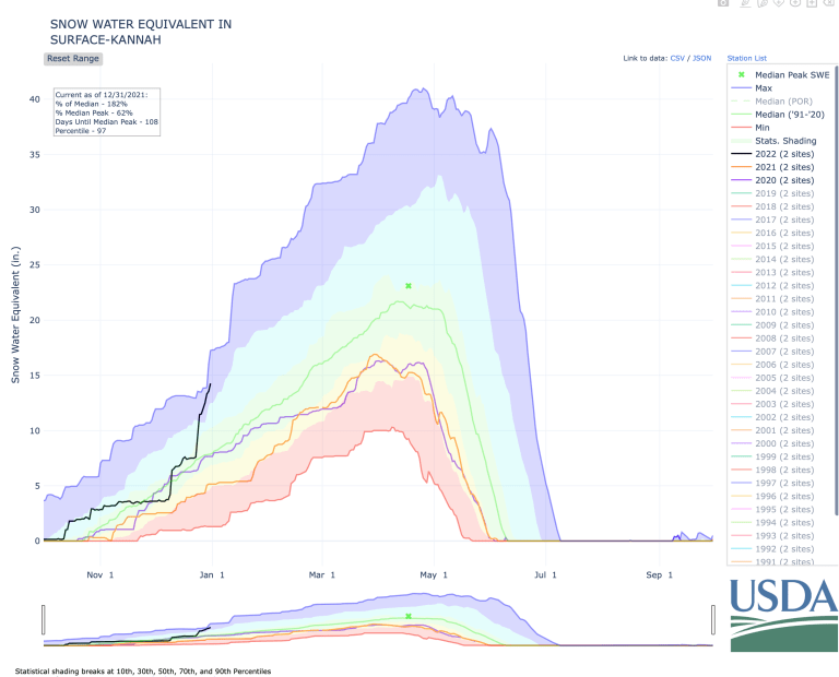 Carroll explained that ASO flies a fixed-wing aircraft across the basin using LiDAR (Light Detection and Ranging) with no snow, and then again with snow. The difference between the two data sets produces a snapshot in time of snow depth every three meters. ASO also uses a spectrometer to measure snow reflectivity. New snowfall has a very high reflectivity, while older snow or snow with dust has a lower reflectivity. Less reflective snowpack will melt more quickly than high reflective snowpack. The resulting ASO data helps to generate precise readings on the amount of water in the snow and guide estimates on where and when this snow may melt soonest. ASO not only quantifies total snow volume but also indicates where snow has moved across the landscape through things like avalanches and wind. ASO-informed stream water forecasts have been shown to have accuracy rates of close to 98% or almost double traditional forecasts…