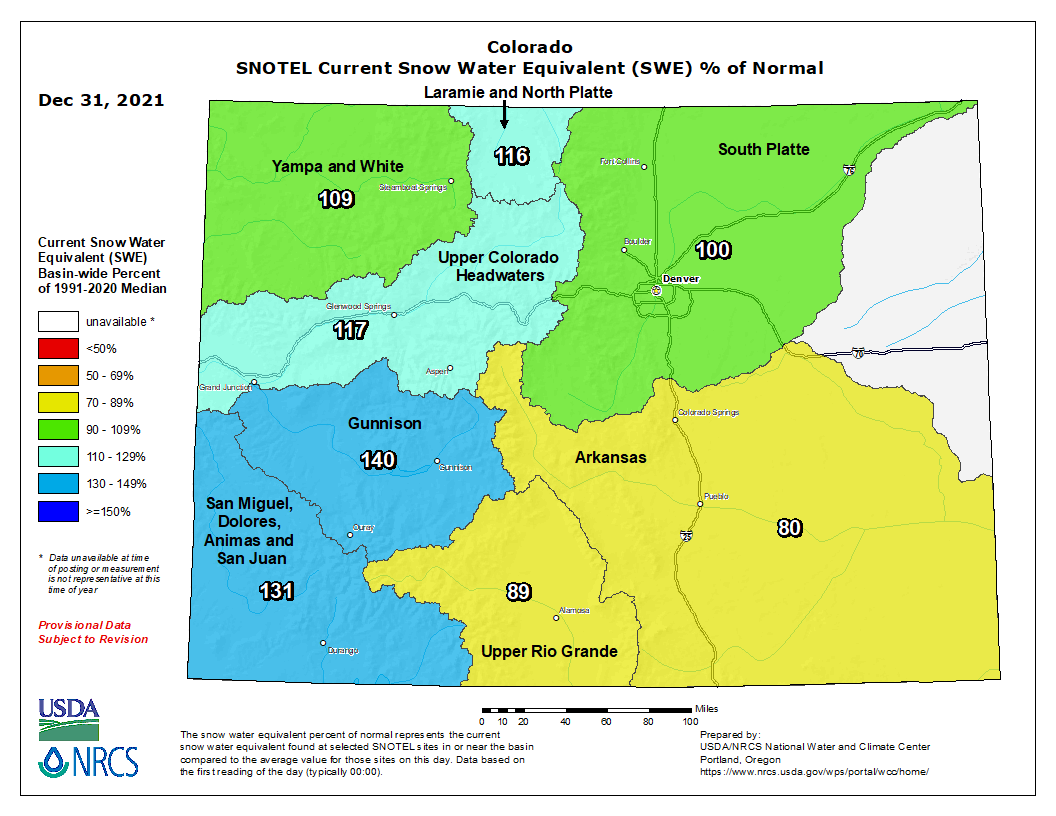 Westwide SNOTEL basin-filled snowpack map April 29, 2022 via the NRCS.