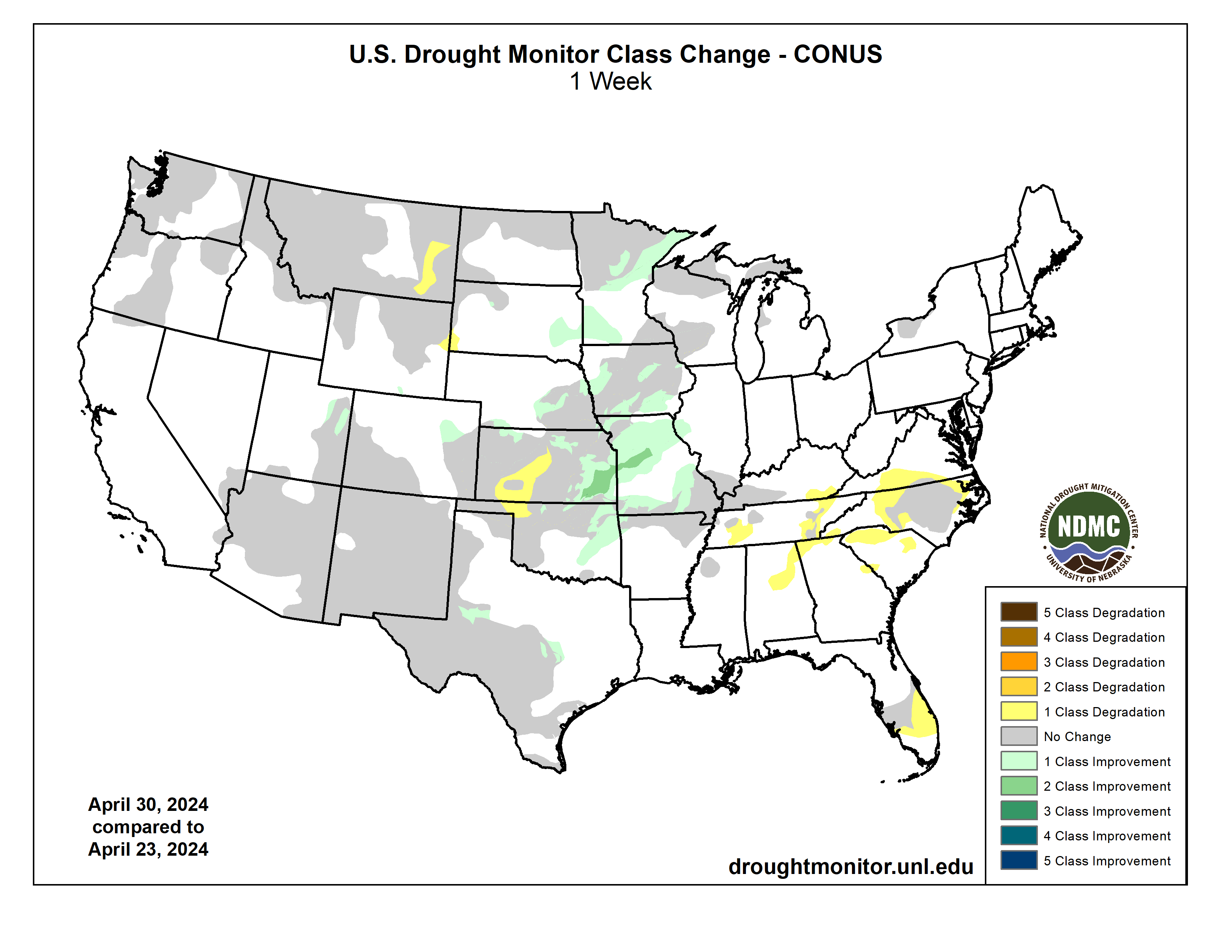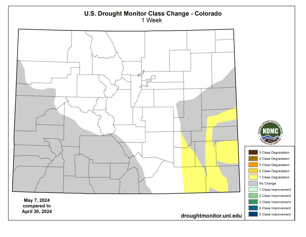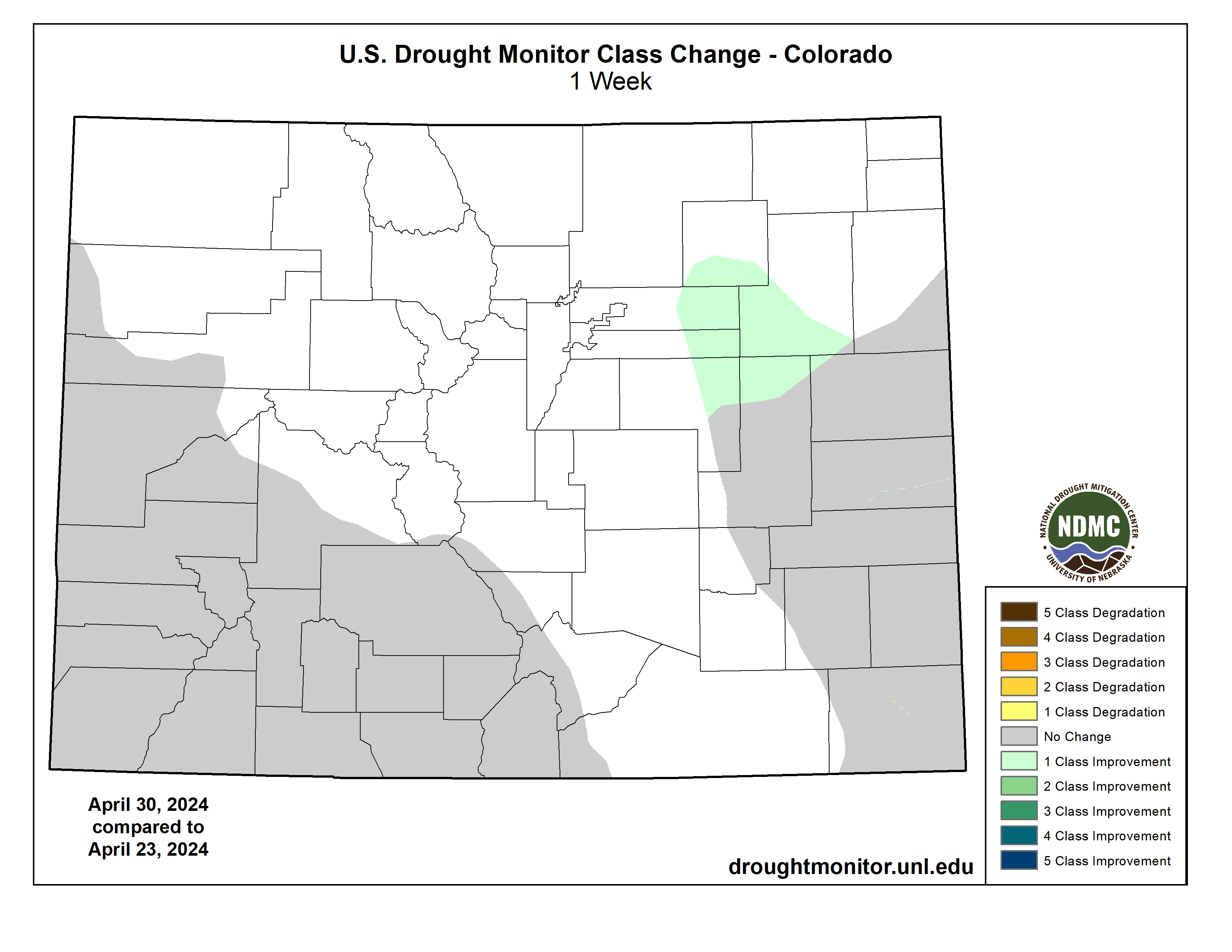 Colorado Drought Monitor one week change map ending April 30, 2024.