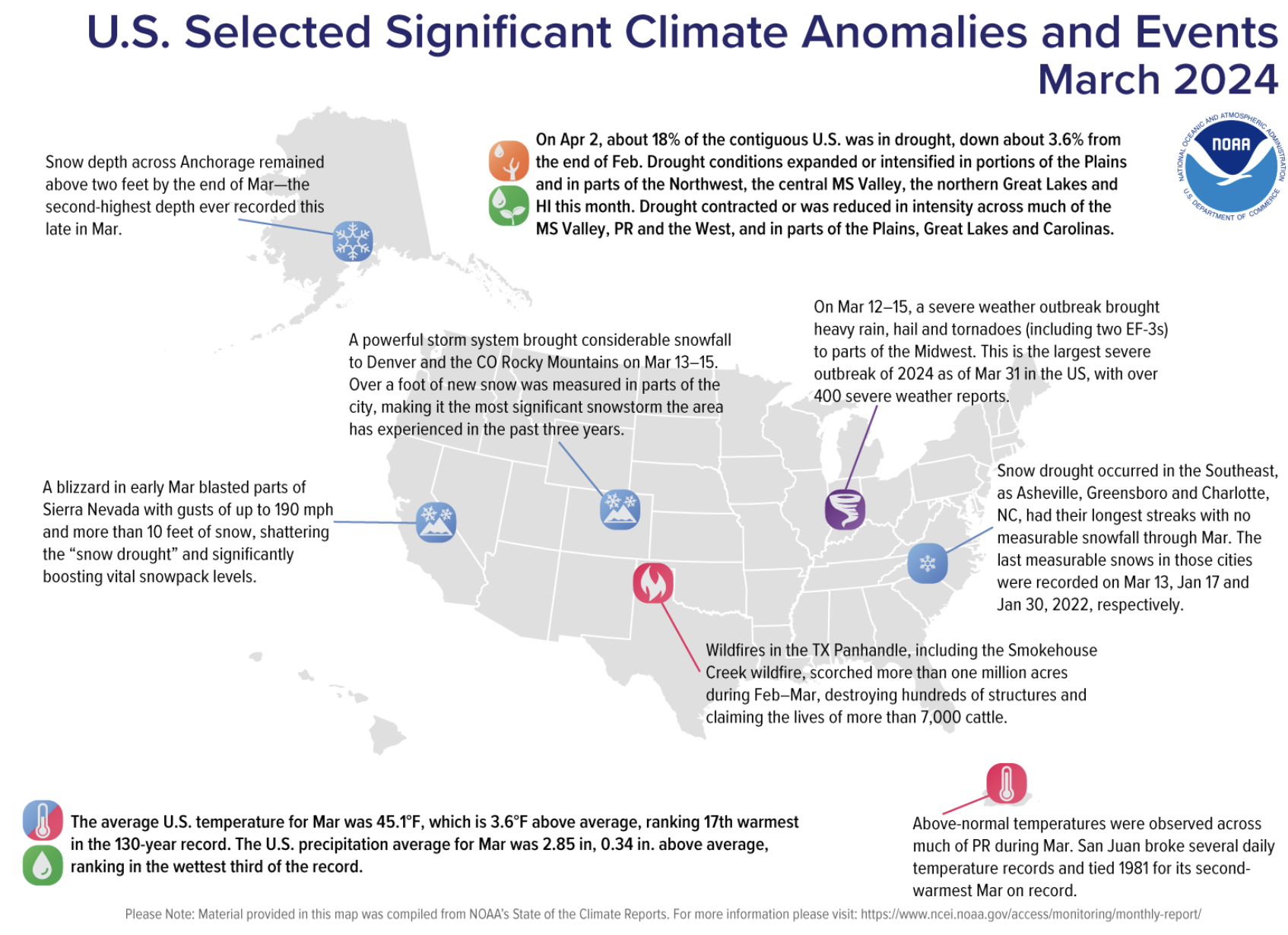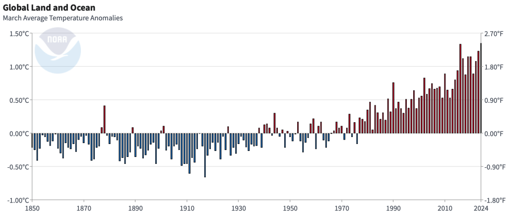 Indeed, March was well above the 1.5-degree Celsius (2.7 degrees Fahrenheit) international target for limiting the worst effects of climate change. The global average temperature measured about 3 degrees, or 1.68 degrees Celsius, warmer than the designated 1850 to 1900 preindustrial reference period. Whatโs more, the global average temperature for the last 12 months โ April 2023 through March 2024 โ is the highest on record, at 2.8 degrees, or 1.58 degrees Celsius, above the preindustrial average.
